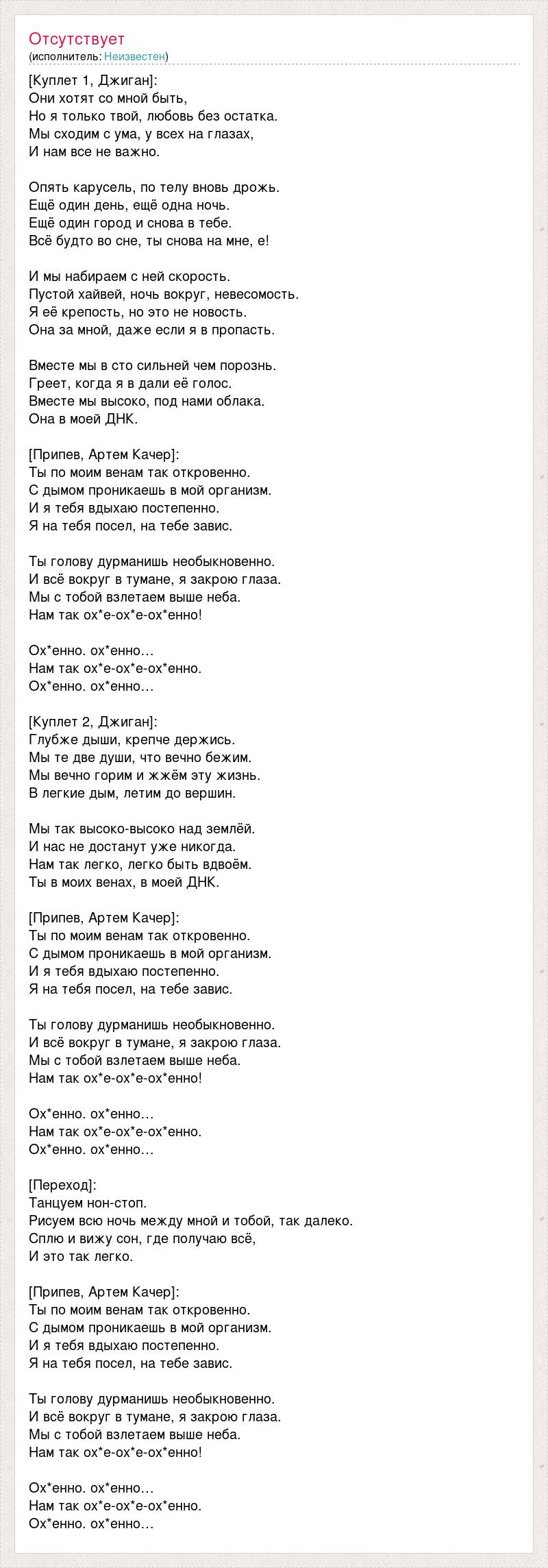 [Куплет 1, Джиган]: Они хотят со мной быть, Но я только твой, любовь без остатка. Мы сходим с ума, у всех на глазах, И нам все не важно. Опять карусель, по телу вновь дрожь. Ещё один день, ещё одна ночь. Ещё один город и снова в тебе. Всё будто во сне, ты снова на мне, е! И мы набираем с ней скорость. Пустой хайвей, ночь вокруг, невесомость. Я её крепость, но это не новость. Она за мной, даже если я в пропасть. Вместе мы в сто сильней чем порознь. Греет, когда я в дали её голос. Вместе мы высоко, под нами облака. Она в моей ДНК. [Припев, Артем Качер]: Ты по моим венам так откровенно. С дымом проникаешь в мой организм. И я тебя вдыхаю постепенно. Я на тебя посел, на тебе завис. Ты голову дурманишь необыкновенно. И всё вокруг в тумане, я закрою глаза. Мы с тобой взлетаем выше неба. Нам так ох*е-ох*е-ох*енно! Ох*енно. ох*енно… Нам так ох*е-ох*е-ох*енно. Ох*енно. ох*енно… [Куплет 2, Джиган]: Глубже дыши, крепче держись. Мы те две души, что вечно бежим. Мы вечно горим и жжём эту жизнь. В легкие дым, летим до вершин. Мы так высоко-высоко над землёй. И нас не достанут уже никогда. Нам так легко, легко быть вдвоём. Ты в моих венах, в моей ДНК. [Припев, Артем Качер]: Ты по моим венам так откровенно. С дымом проникаешь в мой организм. И я тебя вдыхаю постепенно. Я на тебя посел, на тебе завис. Ты голову дурманишь необыкновенно. И всё вокруг в тумане, я закрою глаза. Мы с тобой взлетаем выше неба. Нам так ох*е-ох*е-ох*енно! Ох*енно. ох*енно… Нам так ох*е-ох*е-ох*енно. Ох*енно. ох*енно… [Переход]: Танцуем нон-стоп. Рисуем всю ночь между мной и тобой, так далеко. Сплю и вижу сон, где получаю всё, И это так легко. [Припев, Артем Качер]: Ты по моим венам так откровенно. С дымом проникаешь в мой организм. И я тебя вдыхаю постепенно. Я на тебя посел, на тебе завис. Ты голову дурманишь необыкновенно. И всё вокруг в тумане, я закрою глаза. Мы с тобой взлетаем выше неба. Нам так ох*е-ох*е-ох*енно! Ох*енно. ох*енно… Нам так ох*е-ох*е-ох*енно. Ох*енно. ох*енно…