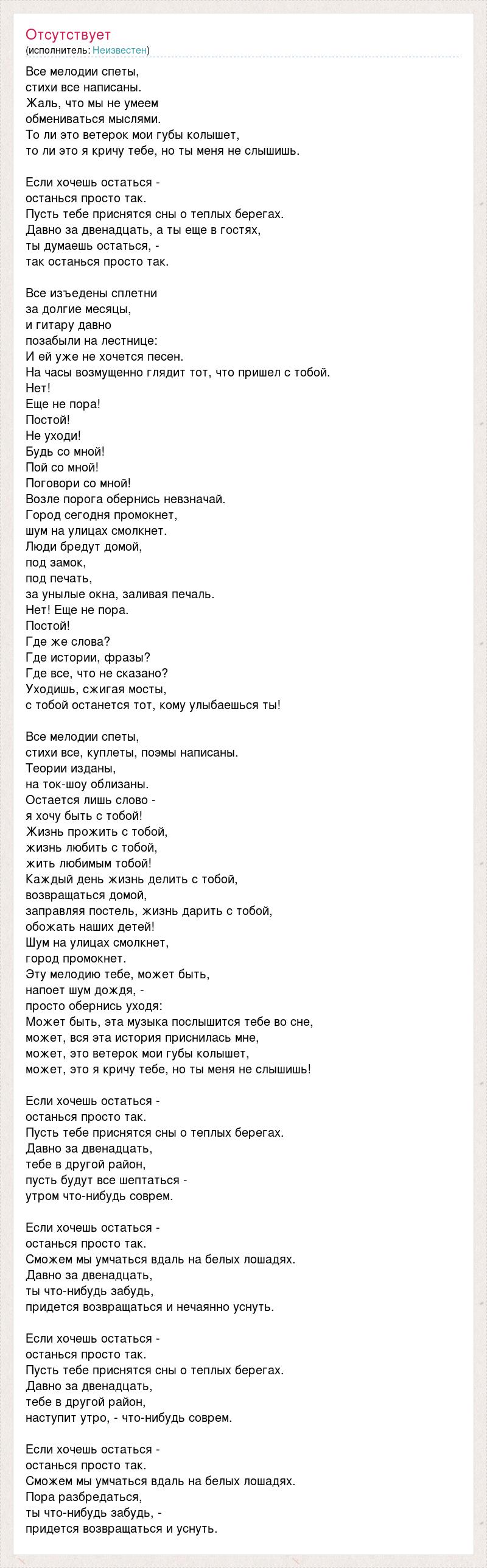 Все мелодии спеты, стихи все написаны. Жаль, что мы не умеем обмениваться мыслями. То ли это ветерок мои губы колышет, то ли это я кричу тебе, но ты меня не слышишь. Если хочешь остаться - останься просто так. Пусть тебе приснятся сны о теплых берегах. Давно за двенадцать, а ты еще в гостях, ты думаешь остаться, - так останься просто так. Все изъедены сплетни за долгие месяцы, и гитару давно позабыли на лестнице: И ей уже не хочется песен. На часы возмущенно глядит тот, что пришел с тобой. Нет! Еще не пора! Постой! Не уходи! Будь со мной! Пой со мной! Поговори со мной! Возле порога обернись невзначай. Город сегодня промокнет, шум на улицах смолкнет. Люди бредут домой, под замок, под печать, за унылые окна, заливая печаль. Нет! Еще не пора. Постой! Где же слова? Где истории, фразы? Где все, что не сказано? Уходишь, сжигая мосты, с тобой останется тот, кому улыбаешься ты! Все мелодии спеты, стихи все, куплеты, поэмы написаны. Теории изданы, на ток-шоу облизаны. Остается лишь слово - я хочу быть с тобой! Жизнь прожить с тобой, жизнь любить с тобой, жить любимым тобой! Каждый день жизнь делить с тобой, возвращаться домой, заправляя постель, жизнь дарить с тобой, обожать наших детей! Шум на улицах смолкнет, город промокнет. Эту мелодию тебе, может быть, напоет шум дождя, - просто обернись уходя: Может быть, эта музыка послышится тебе во сне, может, вся эта история приснилась мне, может, это ветерок мои губы колышет, может, это я кричу тебе, но ты меня не слышишь! Если хочешь остаться - останься просто так. Пусть тебе приснятся сны о теплых берегах. Давно за двенадцать, тебе в другой район, пусть будут все шептаться - утром что-нибудь соврем. Если хочешь остаться - останься просто так. Сможем мы умчаться вдаль на белых лошадях. Давно за двенадцать, ты что-нибудь забудь, придется возвращаться и нечаянно уснуть. Если хочешь остаться - останься просто так. Пусть тебе приснятся сны о теплых берегах. Давно за двенадцать, тебе в другой район, наступит утро, - что-нибудь соврем. Если хочешь остаться - останься просто так. Сможем мы умчаться вдаль на белых лошадях. Пора разбредаться, ты что-нибудь забудь, - придется возвращаться и уснуть.