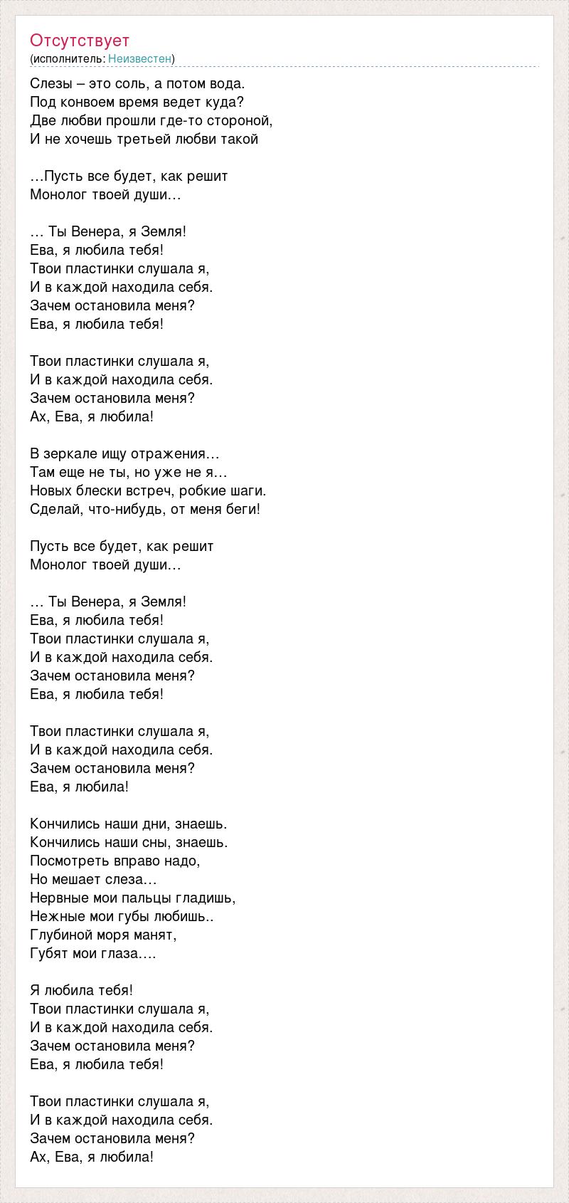 Слезы – это соль, а потом вода. Под конвоем время ведет куда? Две любви прошли где-то стороной, И не хочешь третьей любви такой …Пусть все будет, как решит Монолог твоей души… … Ты Венера, я Земля! Ева, я любила тебя! Твои пластинки слушала я, И в каждой находила себя. Зачем остановила меня? Ева, я любила тебя! Твои пластинки слушала я, И в каждой находила себя. Зачем остановила меня? Ах, Ева, я любила! В зеркале ищу отражения… Там еще не ты, но уже не я… Новых блески встреч, робкие шаги. Сделай, что-нибудь, от меня беги! Пусть все будет, как решит Монолог твоей души… … Ты Венера, я Земля! Ева, я любила тебя! Твои пластинки слушала я, И в каждой находила себя. Зачем остановила меня? Ева, я любила тебя! Твои пластинки слушала я, И в каждой находила себя. Зачем остановила меня? Ева, я любила! Кончились наши дни, знаешь. Кончились наши сны, знаешь. Посмотреть вправо надо, Но мешает слеза… Нервные мои пальцы гладишь, Нежные мои губы любишь.. Глубиной моря манят, Губят мои глаза…. Я любила тебя! Твои пластинки слушала я, И в каждой находила себя. Зачем остановила меня? Ева, я любила тебя! Твои пластинки слушала я, И в каждой находила себя. Зачем остановила меня? Ах, Ева, я любила!