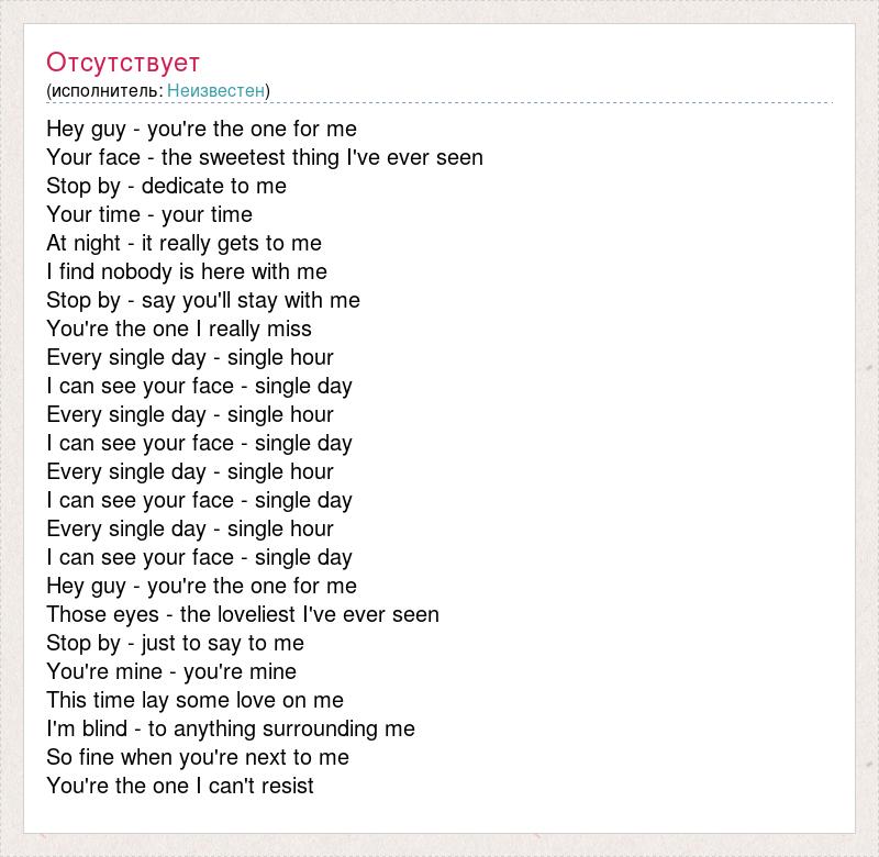 Hey guy - you're the one for me Your face - the sweetest thing I've ever seen Stop by - dedicate to me Your time - your time At night - it really gets to me I find nobody is here with me Stop by - say you'll stay with me You're the one I really miss Every single day - single hour I can see your face - single day Every single day - single hour I can see your face - single day Every single day - single hour I can see your face - single day Every single day - single hour I can see your face - single day Hey guy - you're the one for me Those eyes - the loveliest I've ever seen Stop by - just to say to me You're mine - you're mine This time lay some love on me I'm blind - to anything surrounding me So fine when you're next to me You're the one I can't resist
