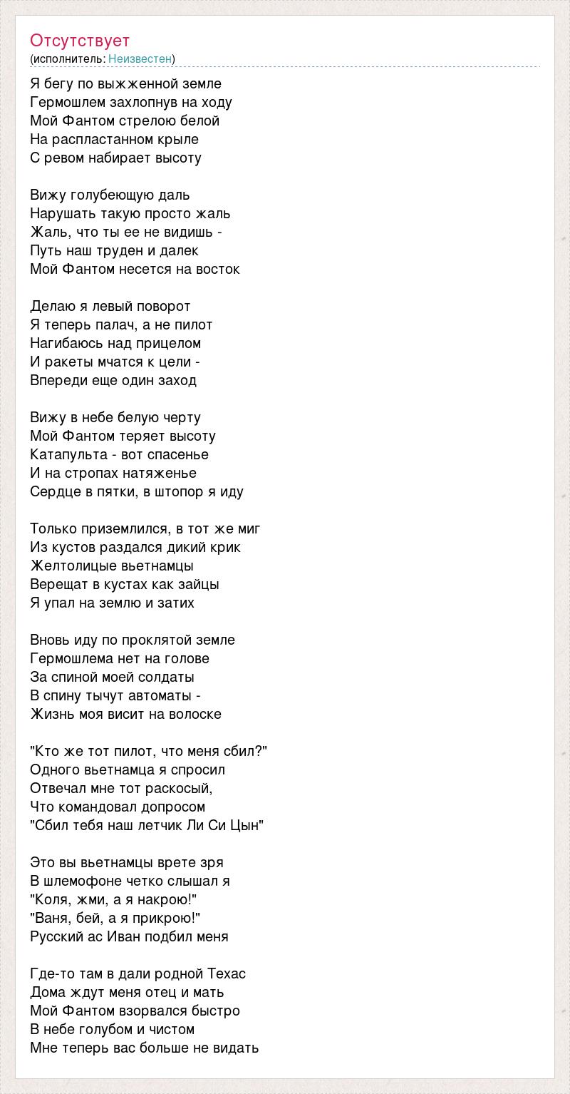 Я бегу по выжженной земле Гермошлем захлопнув на ходу Мой Фантом стрелою белой На распластанном крыле С ревом набирает высоту Вижу голубеющую даль Нарушать такую просто жаль Жаль, что ты ее не видишь - Путь наш труден и далек Мой Фантом несется на восток Делаю я левый поворот Я теперь палач, а не пилот Нагибаюсь над прицелом И ракеты мчатся к цели - Впереди еще один заход Вижу в небе белую черту Мой Фантом теряет высоту Катапульта - вот спасенье И на стропах натяженье Сердце в пятки, в штопор я иду Только приземлился, в тот же миг Из кустов раздался дикий крик Желтолицые вьетнамцы Верещат в кустах как зайцы Я упал на землю и затих Вновь иду по проклятой земле Гермошлема нет на голове За спиной моей солдаты В спину тычут автоматы - Жизнь моя висит на волоске "Кто же тот пилот, что меня сбил?" Одного вьетнамца я спросил Отвечал мне тот раскосый, Что командовал допросом "Сбил тебя наш летчик Ли Си Цын" Это вы вьетнамцы врете зря В шлемофоне четко слышал я "Коля, жми, а я накрою!" "Ваня, бей, а я прикрою!" Русский ас Иван подбил меня Где-то там в дали родной Техас Дома ждут меня отец и мать Мой Фантом взорвался быстро В небе голубом и чистом Мне теперь вас больше не видать