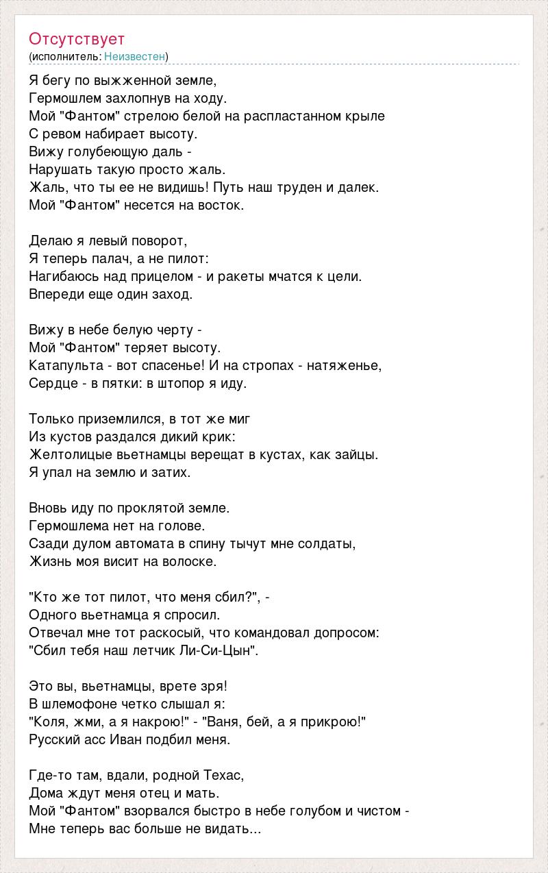 Я бегу по выжженной земле, Гермошлем захлопнув на ходу. Мой "Фантом" стрелою белой на распластанном крыле С ревом набирает высоту. Вижу голубеющую даль - Нарушать такую просто жаль. Жаль, что ты ее не видишь! Путь наш труден и далек. Мой "Фантом" несется на восток. Делаю я левый поворот, Я теперь палач, а не пилот: Нагибаюсь над прицелом - и ракеты мчатся к цели. Впереди еще один заход. Вижу в небе белую черту - Мой "Фантом" теряет высоту. Катапульта - вот спасенье! И на стропах - натяженье, Сердце - в пятки: в штопор я иду. Только приземлился, в тот же миг Из кустов раздался дикий крик: Желтолицые вьетнамцы верещат в кустах, как зайцы. Я упал на землю и затих. Вновь иду по проклятой земле. Гермошлема нет на голове. Сзади дулом автомата в спину тычут мне солдаты, Жизнь моя висит на волоске. "Кто же тот пилот, что меня сбил?", - Одного вьетнамца я спросил. Отвечал мне тот раскосый, что командовал допросом: "Сбил тебя наш летчик Ли-Си-Цын". Это вы, вьетнамцы, врете зря! В шлемофоне четко слышал я: "Коля, жми, а я накрою!" - "Ваня, бей, а я прикрою!" Русский асс Иван подбил меня. Где-то там, вдали, родной Техас, Дома ждут меня отец и мать. Мой "Фантом" взорвался быстро в небе голубом и чистом - Мне теперь вас больше не видать...