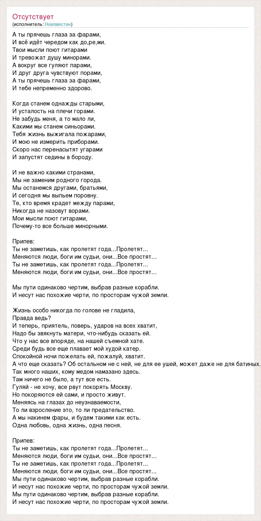 А ты прячешь глаза за фарами, И всё идёт чередом как до,ре,ми. Твои мысли поют гитарами И тревожат душу минорами. А вокруг все гуляют парами, И друг друга чувствуют порами, А ты прячешь глаза за фарами, И тебе непременно здорово. Когда станем однажды старыми, И усталость на плечи горами. Не забудь меня, а то мало ли, Какими мы станем синьорами. Тебя жизнь выжигала пожарами, И мою не измерить приборами. Скоро нас перенасытят угарами И запустят седины в бороду. И не важно какими странами, Мы не заменим родного города. Мы останемся другами, братьями, И сегодня мы выпьем поровну. Те, кто время крадет между парами, Никогда не назовут ворами. Мои мысли поют гитарами, Почему-то все больше минорными. Припев: Ты не заметишь, как пролетят года...Пролетят... Меняются люди, боги им судьи, они...Все простят... Ты не заметишь, как пролетят года...Пролетят... Меняются люди, боги им судьи, они...Все простят... Мы пути одинаково чертим, выбрав разные корабли. И несут нас похожие черти, по просторам чужой земли. Жизнь особо никогда по голове не гладила, Правда ведь? И теперь, приятель, поверь, ударов на всех хватит, Надо бы звякнуть матери, что-нибудь сказать ей. Что у нас все впоряде, на нашей съемной хате. Среди будь все еще плавает мой худой катер. Спокойной ночи пожелать ей, пожалуй, хватит. А что еще сказать? Об остальном не с ней, не для ее ушей, может даже не для батиных. Так много наших, кому медом намазано здесь. Там ничего не было, а тут все есть. Гуляй - не хочу, все рвут покорять Москву. Но покоряются ей сами, и просто живут. Меняясь на глазах до неузнаваемости, То ли взросление это, то ли предательство. А мы накинем фары, и будем такими как есть. Одна любовь, одна жизнь, одна песня. Припев: Ты не заметишь, как пролетят года...Пролетят... Меняются люди, боги им судьи, они...Все простят... Ты не заметишь, как пролетят года...Пролетят... Меняются люди, боги им судьи, они...Все простят... Мы пути одинаково чертим, выбрав разные корабли. И несут нас похожие черти, по просторам чужой земли. Мы пути одинаково чертим, выбрав разные корабли. И несут нас похожие черти, по просторам чужой земли.