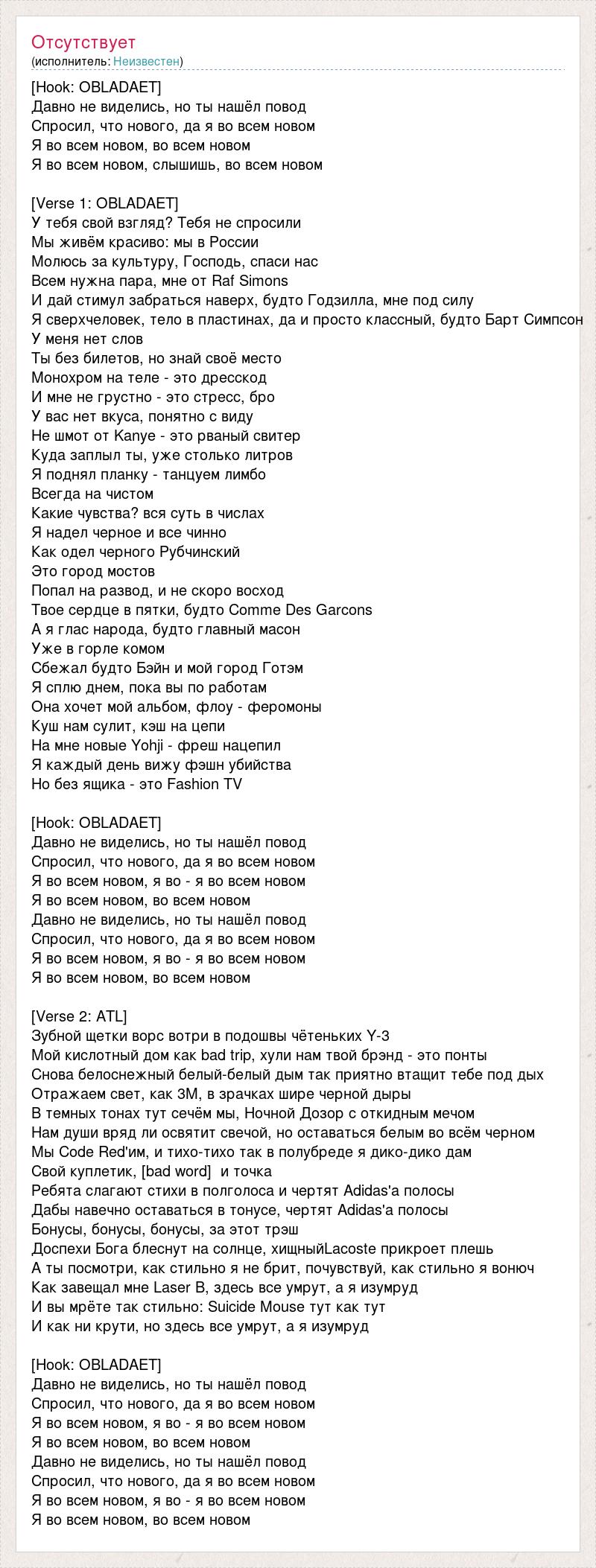 [Hook: OBLADAET] Давно не виделись, но ты нашёл повод Спросил, что нового, да я во всем новом Я во всем новом, во всем новом Я во всем новом, слышишь, во всем новом [Verse 1: OBLADAET] У тебя свой взгляд? Тебя не спросили Мы живём красиво: мы в России Молюсь за культуру, Господь, спаси нас Всем нужна пара, мне от Raf Simons И дай стимул забраться наверх, будто Годзилла, мне под силу Я сверхчеловек, тело в пластинах, да и просто классный, будто Барт Симпсон У меня нет слов Ты без билетов, но знай своё место Монохром на теле - это дресскод И мне не грустно - это стресс, бро У вас нет вкуса, понятно с виду Не шмот от Kanye - это рваный свитер Куда заплыл ты, уже столько литров Я поднял планку - танцуем лимбо Всегда на чистом Какие чувства? вся суть в числах Я надел черное и все чинно Как одел черного Рубчинский Это город мостов Попал на развод, и не скоро восход Твое сердце в пятки, будто Comme Des Garcons А я глас народа, будто главный масон Уже в горле комом Сбежал будто Бэйн и мой город Готэм Я сплю днем, пока вы по работам Она хочет мой альбом, флоу - феромоны Куш нам сулит, кэш на цепи На мне новые Yohji - фреш нацепил Я каждый день вижу фэшн убийства Но без ящика - это Fashion TV [Hook: OBLADAET] Давно не виделись, но ты нашёл повод Спросил, что нового, да я во всем новом Я во всем новом, я во - я во всем новом Я во всем новом, во всем новом Давно не виделись, но ты нашёл повод Спросил, что нового, да я во всем новом Я во всем новом, я во - я во всем новом Я во всем новом, во всем новом [Verse 2: ATL] Зубной щетки ворс вотри в подошвы чётеньких Y-3 Мой кислотный дом как bad trip, хули нам твой брэнд - это понты Снова белоснежный белый-белый дым так приятно втащит тебе под дых Отражаем свет, как 3M, в зрачках шире черной дыры В темных тонах тут сечём мы, Ночной Дозор с откидным мечом Нам души вряд ли освятит свечой, но оставаться белым во всём черном Мы Code Red'им, и тихо-тихо так в полубреде я дико-дико дам Свой куплетик, [bad word] и точка Ребята слагают стихи в полголоса и чертят Adidas'а полосы Дабы навечно оставаться в тонусе, чертят Adidas'а полосы Бонусы, бонусы, бонусы, за этот трэш Доспехи Бога блеснут на солнце, хищныйLacoste прикроет плешь А ты посмотри, как стильно я не брит, почувствуй, как стильно я вонюч Как завещал мне Laser B, здесь все умрут, а я изумруд И вы мрёте так стильно: Suicide Mouse тут как тут И как ни крути, но здесь все умрут, а я изумруд [Hook: OBLADAET] Давно не виделись, но ты нашёл повод Спросил, что нового, да я во всем новом Я во всем новом, я во - я во всем новом Я во всем новом, во всем новом Давно не виделись, но ты нашёл повод Спросил, что нового, да я во всем новом Я во всем новом, я во - я во всем новом Я во всем новом, во всем новом