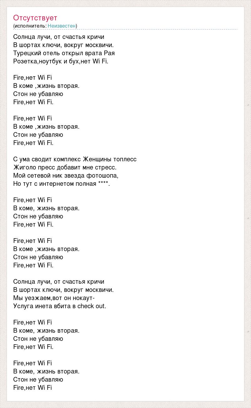 Солнца лучи, от счастья кричи В шортах ключи, вокруг москвичи. Турецкий отель открыл врата Рая Розетка,ноутбук и бух,нет Wi Fi. Fire,нет Wi Fi В коме ,жизнь вторая. Стон не убавляю Fire,нет Wi Fi. Fire,нет Wi Fi В коме ,жизнь вторая. Стон не убавляю Fire,нет Wi Fi. С ума сводит комплекс Женщины топлесс Жиголо пресс добавит мне стресс. Мой сетевой ник звезда фотошопа, Но тут с интернетом полная ****. Fire,нет Wi Fi В коме, жизнь вторая. Стон не убавляю Fire,нет Wi Fi. Fire,нет Wi Fi В коме ,жизнь вторая. Стон не убавляю Fire,нет Wi Fi. Солнца лучи, от счастья кричи В шортах ключи, вокруг москвичи. Мы уезжаем,вот он нокаут- Услуга инета вбита в check out. Fire,нет Wi Fi В коме, жизнь вторая. Стон не убавляю Fire,нет Wi Fi. Fire,нет Wi Fi В коме, жизнь вторая. Стон не убавляю Fire,нет Wi Fi
