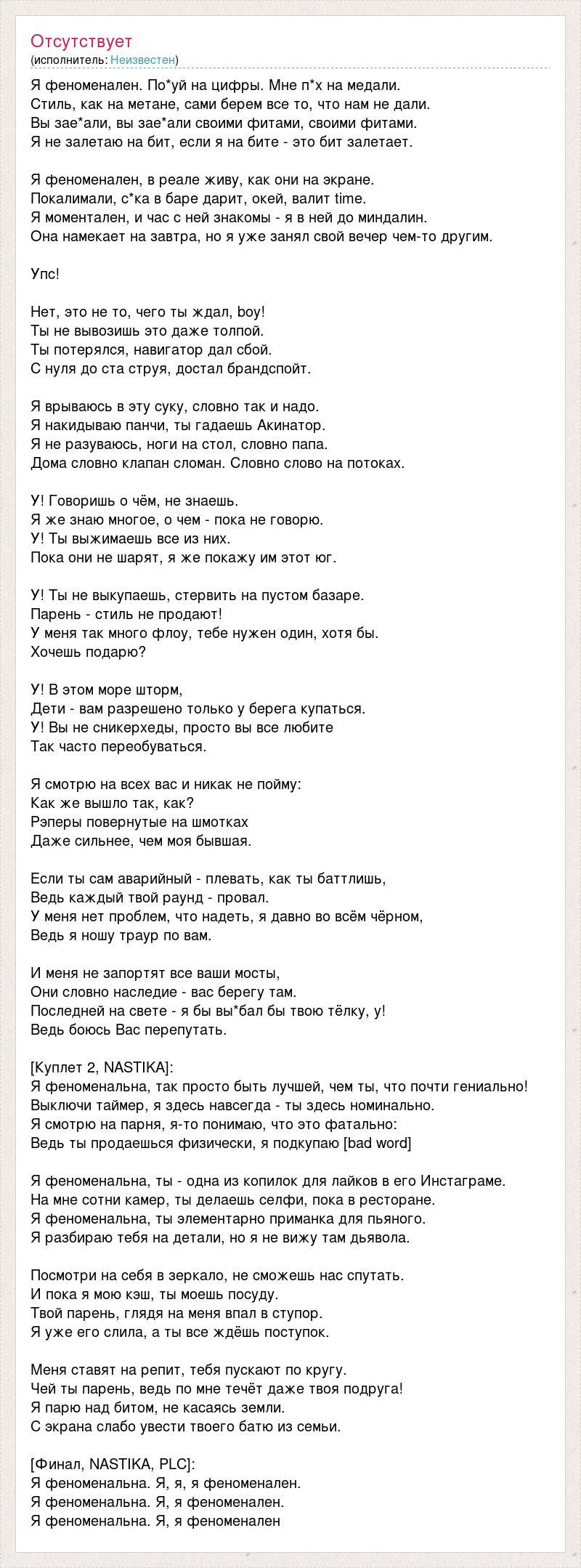 Я феноменален. По*уй на цифры. Мне п*х на медали. Стиль, как на метане, сами берем все то, что нам не дали. Вы зае*али, вы зае*али своими фитами, своими фитами. Я не залетаю на бит, если я на бите - это бит залетает. Я феноменален, в реале живу, как они на экране. Покалимали, с*ка в баре дарит, окей, валит time. Я моментален, и час с ней знакомы - я в ней до миндалин. Она намекает на завтра, но я уже занял cвой вечер чем-то другим. Упс! Нет, это не то, чего ты ждал, boy! Ты не вывозишь это даже толпой. Ты потерялся, навигатор дал сбой. С нуля до ста струя, достал брандспойт. Я врываюсь в эту суку, словно так и надо. Я накидываю панчи, ты гадаешь Акинатор. Я не разуваюсь, ноги на стол, словно папа. Дома словно клапан сломан. Словно слово на потоках. У! Говоришь о чём, не знаешь. Я же знаю многое, о чем - пока не говорю. У! Ты выжимаешь все из них. Пока они не шарят, я же покажу им этот юг. У! Ты не выкупаешь, стервить на пустом базаре. Парень - стиль не продают! У меня так много флоу, тебе нужен один, хотя бы. Хочешь подарю? У! В этом море шторм, Дети - вам разрешено только у берега купаться. У! Вы не сникерхеды, просто вы все любите Так часто переобуваться. Я смотрю на всех вас и никак не пойму: Как же вышло так, как? Рэперы повернутые на шмотках Даже сильнее, чем моя бывшая. Если ты сам аварийный - плевать, как ты баттлишь, Ведь каждый твой раунд - провал. У меня нет проблем, что надеть, я давно во всём чёрном, Ведь я ношу траур по вам. И меня не запортят все ваши мосты, Они словно наследие - вас берегу там. Последней на свете - я бы вы*бал бы твою тёлку, у! Ведь боюсь Вас перепутать. [Куплет 2, NASTIKA]: Я феноменальна, так просто быть лучшей, чем ты, что почти гениально! Выключи таймер, я здесь навсегда - ты здесь номинально. Я смотрю на парня, я-то понимаю, что это фатально: Ведь ты продаешься физически, я подкупаю [bad word] Я феноменальна, ты - одна из копилок для лайков в его Инстаграме. На мне сотни камер, ты делаешь селфи, пока в ресторане. Я феноменальна, ты элементарно приманка для пьяного. Я разбираю тебя на детали, но я не вижу там дьявола. Посмотри на себя в зеркало, не сможешь нас спутать. И пока я мою кэш, ты моешь посуду. Твой парень, глядя на меня впал в ступор. Я уже его слила, а ты все ждёшь поступок. Меня ставят на репит, тебя пускают по кругу. Чей ты парень, ведь по мне течёт даже твоя подруга! Я парю над битом, не касаясь земли. С экрана слабо увести твоего батю из семьи. [Финал, NASTIKA, PLC]: Я феноменальна. Я, я, я феноменален. Я феноменальна. Я, я феноменален. Я феноменальна. Я, я феноменален