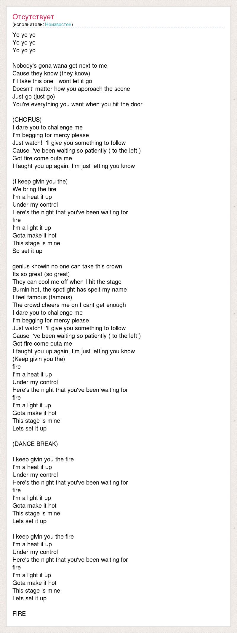 Yo yo yo Yo yo yo Yo yo yo Nobody's gona wana get next to me Cause they know (they know) I'll take this one I wont let it go Doesn't' matter how you approach the scene Just go (just go) You're everything you want when you hit the door (CHORUS) I dare you to challenge me I'm begging for mercy please Just watch! I'll give you something to follow Cause I've been waiting so patiently ( to the left ) Got fire come outa me I faught you up again, I'm just letting you know (I keep givin you the) We bring the fire I'm a heat it up Under my control Here's the night that you've been waiting for fire I'm a light it up Gota make it hot This stage is mine So set it up genius knowin no one can take this crown Its so great (so great) They can cool me off when I hit the stage Burnin hot, the spotlight has spelt my name I feel famous (famous) The crowd cheers me on I cant get enough I dare you to challenge me I'm begging for mercy please Just watch! I'll give you something to follow Cause I've been waiting so patiently ( to the left ) Got fire come outa me I faught you up again, I'm just letting you know (Keep givin you the) fire I'm a heat it up Under my control Here's the night that you've been waiting for fire I'm a light it up Gota make it hot This stage is mine Lets set it up (DANCE BREAK) I keep givin you the fire I'm a heat it up Under my control Here's the night that you've been waiting for fire I'm a light it up Gota make it hot This stage is mine Lets set it up I keep givin you the fire I'm a heat it up Under my control Here's the night that you've been waiting for fire I'm a light it up Gota make it hot This stage is mine Lets set it up FIRE