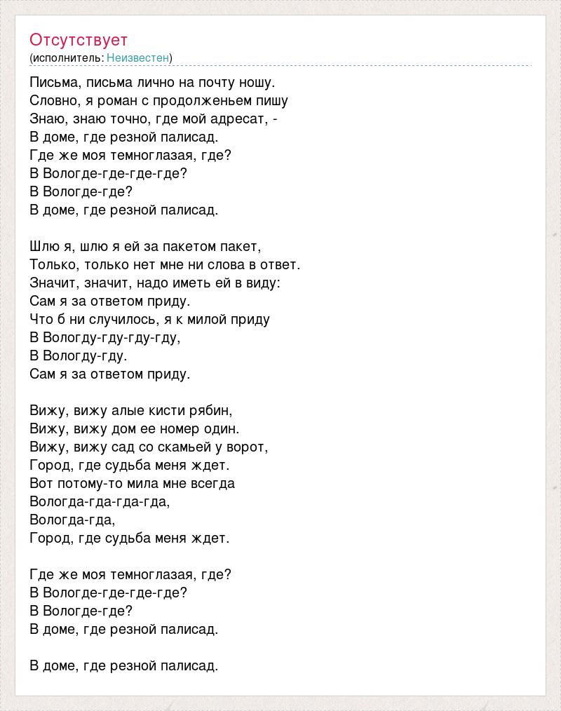 Письма, письма лично на почту ношу. Словно, я роман с продолженьем пишу Знаю, знаю точно, где мой адресат, - В доме, где резной палисад. Где же моя темноглазая, где? В Вологде-где-где-где? В Вологде-где? В доме, где резной палисад. Шлю я, шлю я ей за пакетом пакет, Только, только нет мне ни слова в ответ. Значит, значит, надо иметь ей в виду: Сам я за ответом приду. Что б ни случилось, я к милой приду В Вологду-гду-гду-гду, В Вологду-гду. Сам я за ответом приду. Вижу, вижу алые кисти рябин, Вижу, вижу дом ее номер один. Вижу, вижу сад со скамьей у ворот, Город, где судьба меня ждет. Вот потому-то мила мне всегда Вологда-гда-гда-гда, Вологда-гда, Город, где судьба меня ждет. Где же моя темноглазая, где? В Вологде-где-где-где? В Вологде-где? В доме, где резной палисад. В доме, где резной палисад.
