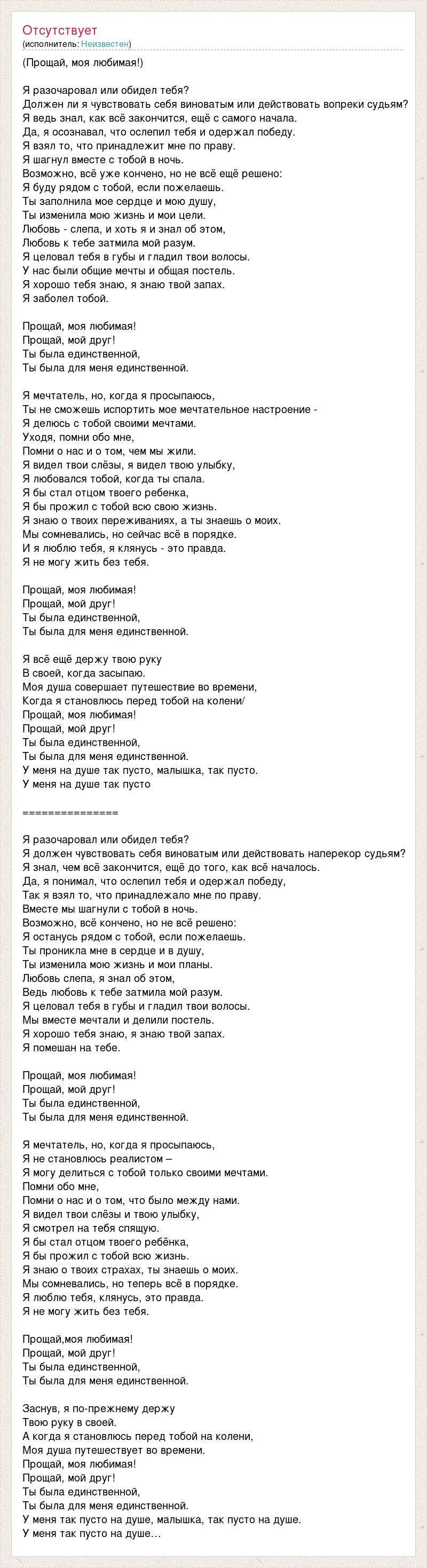 (Прощай, моя любимая!) Я разочаровал или обидел тебя? Должен ли я чувствовать себя виноватым или действовать вопреки судьям? Я ведь знал, как всё закончится, ещё с самого начала. Да, я осознавал, что ослепил тебя и одержал победу. Я взял то, что принадлежит мне по праву. Я шагнул вместе с тобой в ночь. Возможно, всё уже кончено, но не всё ещё решено: Я буду рядом с тобой, если пожелаешь. Ты заполнила мое сердце и мою душу, Ты изменила мою жизнь и мои цели. Любовь - слепа, и хоть я и знал об этом, Любовь к тебе затмила мой разум. Я целовал тебя в губы и гладил твои волосы. У нас были общие мечты и общая постель. Я хорошо тебя знаю, я знаю твой запах. Я заболел тобой. Прощай, моя любимая! Прощай, мой друг! Ты была единственной, Ты была для меня единственной. Я мечтатель, но, когда я просыпаюсь, Ты не сможешь испортить мое мечтательное настроение - Я делюсь с тобой своими мечтами. Уходя, помни обо мне, Помни о нас и о том, чем мы жили. Я видел твои слёзы, я видел твою улыбку, Я любовался тобой, когда ты спала. Я бы стал отцом твоего ребенка, Я бы прожил с тобой всю свою жизнь. Я знаю о твоих переживаниях, а ты знаешь о моих. Мы сомневались, но сейчас всё в порядке. И я люблю тебя, я клянусь - это правда. Я не могу жить без тебя. Прощай, моя любимая! Прощай, мой друг! Ты была единственной, Ты была для меня единственной. Я всё ещё держу твою руку В своей, когда засыпаю. Моя душа совершает путешествие во времени, Когда я становлюсь перед тобой на колени/ Прощай, моя любимая! Прощай, мой друг! Ты была единственной, Ты была для меня единственной. У меня на душе так пусто, малышка, так пусто. У меня на душе так пусто =============== Я разочаровал или обидел тебя? Я должен чувствовать себя виноватым или действовать наперекор судьям? Я знал, чем всё закончится, ещё до того, как всё началось. Да, я понимал, что ослепил тебя и одержал победу, Так я взял то, что принадлежало мне по праву. Вместе мы шагнули с тобой в ночь. Возможно, всё кончено, но не всё решено: Я останусь рядом с тобой, если пожелаешь. Ты проникла мне в сердце и в душу, Ты изменила мою жизнь и мои планы. Любовь слепа, я знал об этом, Ведь любовь к тебе затмила мой разум. Я целовал тебя в губы и гладил твои волосы. Мы вместе мечтали и делили постель. Я хорошо тебя знаю, я знаю твой запах. Я помешан на тебе. Прощай, моя любимая! Прощай, мой друг! Ты была единственной, Ты была для меня единственной. Я мечтатель, но, когда я просыпаюсь, Я не становлюсь реалистом – Я могу делиться с тобой только своими мечтами. Помни обо мне, Помни о нас и о том, что было между нами. Я видел твои слёзы и твою улыбку, Я смотрел на тебя спящую. Я бы стал отцом твоего ребёнка, Я бы прожил с тобой всю жизнь. Я знаю о твоих страхах, ты знаешь о моих. Мы сомневались, но теперь всё в порядке. Я люблю тебя, клянусь, это правда. Я не могу жить без тебя. Прощай,моя любимая! Прощай, мой друг! Ты была единственной, Ты была для меня единственной. Заснув, я по-прежнему держу Твою руку в своей. А когда я становлюсь перед тобой на колени, Моя душа путешествует во времени. Прощай, моя любимая! Прощай, мой друг! Ты была единственной, Ты была для меня единственной. У меня так пусто на душе, малышка, так пусто на душе. У меня так пусто на душе…