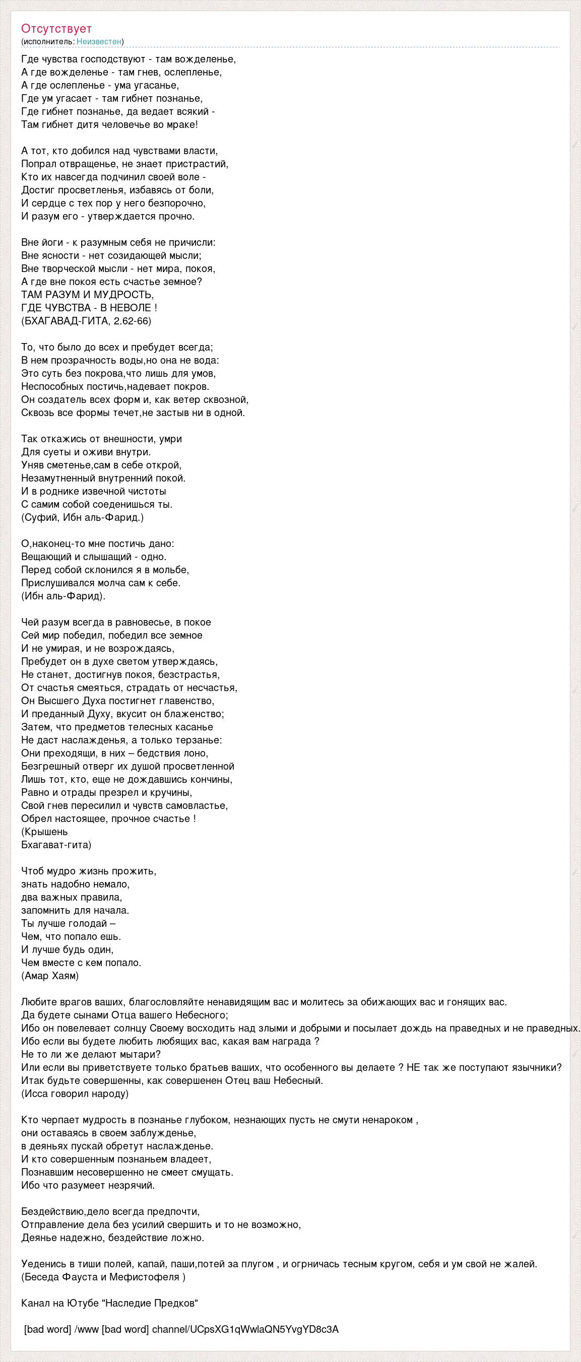 Где чувства господствуют - там вожделенье, А где вожделенье - там гнев, ослепленье, А где ослепленье - ума угасанье, Где ум угасает - там гибнет познанье, Где гибнет познанье, да ведает всякий - Там гибнет дитя человечье во мраке! А тот, кто добился над чувствами власти, Попрал отвращенье, не знает пристрастий, Кто их навсегда подчинил своей воле - Достиг просветленья, избавясь от боли, И сердце с тех пор у него безпорочно, И разум его - утверждается прочно. Вне йоги - к разумным себя не причисли: Вне ясности - нет созидающей мысли; Вне творческой мысли - нет мира, покоя, А где вне покоя есть счастье земное? ТАМ РАЗУМ И МУДРОСТЬ, ГДЕ ЧУВСТВА - В НЕВОЛЕ ! (БХАГАВАД-ГИТА, 2.62-66) То, что было до всех и пребудет всегда; В нем прозрачность воды,но она не вода: Это суть без покрова,что лишь для умов, Неспособных постичь,надевает покров. Он создатель всех форм и, как ветер сквозной, Сквозь все формы течет,не застыв ни в одной. Так откажись от внешности, умри Для суеты и оживи внутри. Уняв сметенье,сам в себе открой, Незамутненный внутренний покой. И в роднике извечной чистоты С самим собой соеденишься ты. (Суфий, Ибн аль-Фарид.) О,наконец-то мне постичь дано: Вещающий и слышащий - одно. Перед собой склонился я в мольбе, Прислушивался молча сам к себе. (Ибн аль-Фарид). Чей разум всегда в равновесье, в покое Сей мир победил, победил все земное И не умирая, и не возрождаясь, Пребудет он в духе светом утверждаясь, Не станет, достигнув покоя, безстрастья, От счастья смеяться, страдать от несчастья, Он Высшего Духа постигнет главенство, И преданный Духу, вкусит он блаженство; Затем, что предметов телесных касанье Не даст наслажденья, а только терзанье: Они преходящи, в них – бедствия лоно, Безгрешный отверг их душой просветленной Лишь тот, кто, еще не дождавшись кончины, Равно и отрады презрел и кручины, Свой гнев пересилил и чувств самовластье, Обрел настоящее, прочное счастье ! (Крышень Бхагават-гита) Чтоб мудро жизнь прожить, знать надобно немало, два важных правила, запомнить для начала. Ты лучше голодай – Чем, что попало ешь. И лучше будь один, Чем вместе с кем попало. (Амар Хаям) Любите врагов ваших, благословляйте ненавидящим вас и молитесь за обижающих вас и гонящих вас. Да будете сынами Отца вашего Небесного; Ибо он повелевает солнцу Своему восходить над злыми и добрыми и посылает дождь на праведных и не праведных. Ибо если вы будете любить любящих вас, какая вам награда ? Не то ли же делают мытари? Или если вы приветствуете только братьев ваших, что особенного вы делаете ? НЕ так же поступают язычники? Итак будьте совершенны, как совершенен Отец ваш Небесный. (Исса говорил народу) Кто черпает мудрость в познанье глубоком, незнающих пусть не смути ненароком , они оставаясь в своем заблужденье, в деяньях пускай обретут наслажденье. И кто совершенным познаньем владеет, Познавшим несовершенно не смеет смущать. Ибо что разумеет незрячий. Бездействию,дело всегда предпочти, Отправление дела без усилий свершить и то не возможно, Деянье надежно, бездействие ложно. Уеденись в тиши полей, капай, паши,потей за плугом , и огрничась тесным кругом, себя и ум свой не жалей. (Беседа Фауста и Мефистофеля ) Канал на Ютубе "Наследие Предков" [bad word] /www [bad word] channel/UCpsXG1qWwlaQN5YvgYD8c3A