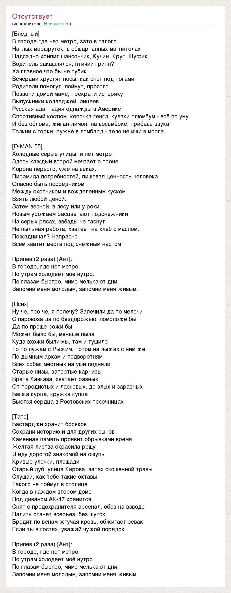 [Бледный] В городе где нет метро, зато в талого Наглых маршруток, в обшарпанных магнитолах Надсадно хрипит шансончик, Кучин, Круг, Шуфик Водитель закашлялся, птичий грипп? Ха главное что бы не тубик Вечерами хрустят носы, как снег под ногами Родители помогут, поймут, простят Позвони домой маме, прекрати истерику Выпускники колледжей, лицеев Русская адаптация однажды в Америке Спортивный костюм, кепочка генгл, кулаки плюмбум - всё по уму И без облома, жиган-лимон, на восьмёрке, прибавь звука Толкни с горки, ружьё в ломбард - тело не ищи в морге. [D-MAN 55] Холодные серые улицы, и нет метро Здесь каждый второй мечтает о троне Корона первого, уже на веках. Пирамида потребностей, пищевая ценность человека Опасно быть посредником Между охотником и вожделенным куском Взять любой ценой. Затем весной, в лесу или у реки. Новым урожаем расцветают подснежники На серых рясах, звёзды не гаснут, Не пыльная работа, хватает на хлеб с маслом. Пожадничал? Напрасно Всем хватит места под снежным настом Припев (2 раза) [Ант]: В городе, где нет метро, По утрам холодеет моё нутро. По глазам быстро, мимо мелькают дни, Запомни меня молодым, запомни меня живым. [Псих] Ну че, про че, я полечу? Залечили да по мелочи С паровоза да по бездорожью, помоложе бы Да по проще рожи бы Может было бы, меньше пыла Куда вхожи были мы, там и тушило То по лужам с Рыжим, потом на лыжах с ним же По дымным аркам и подворотням Всех собак местных на уши подняли Старые низы, затертые карнизы Врата Кавказа, хватает разных От породистых и ласковых, до злых и заразных Башка курца, кружка купца Бьются сердца в Ростовских песочницах [Тато] Бастарджи хранит босяков Сохрани историю и для других сынов Каменная память проявит обрывками время Желтая листва окрасила рощу Я иду дорогой знакомой на ощупь Кривые улочки, площади Старый дуб, улица Кирова, запах скошенной травы Слушай, как тебе такие октавы Такого не поймут в столице Когда в каждом втором доме Под диваном АК-47 хранится Снят с предохранителя арсенал, обоз на взводе Палить станет всерьез, без шуток Бродит по венам жгучая кровь, обжигает зевак Если ты в гостях, уважай чужой порядок Припев (2 раза) [Ант]: В городе, где нет метро, По утрам холодеет моё нутро. По глазам быстро, мимо мелькают дни, Запомни меня молодым, запомни меня живым.