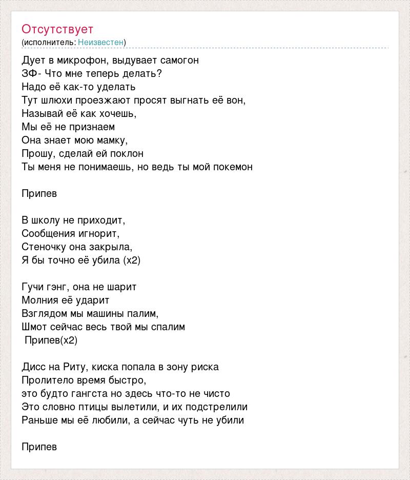 Дует в микрофон, выдувает самогон ЗФ- Что мне теперь делать? Надо её как-то уделать Тут шлюхи проезжают просят выгнать её вон, Называй её как хочешь, Мы её не признаем Она знает мою мамку, Прошу, сделай ей поклон Ты меня не понимаешь, но ведь ты мой покемон Припев В школу не приходит, Сообщения игнорит, Стеночку она закрыла, Я бы точно её убила (x2) Гучи гэнг, она не шарит Молния её ударит Взглядом мы машины палим, Шмот сейчас весь твой мы спалим Припев(х2) Дисс на Риту, киска попала в зону риска Пролитело время быстро, это будто гангста но здесь что-то не чисто Это словно птицы вылетили, и их подстрелили Раньше мы её любили, а сейчас чуть не убили Припев