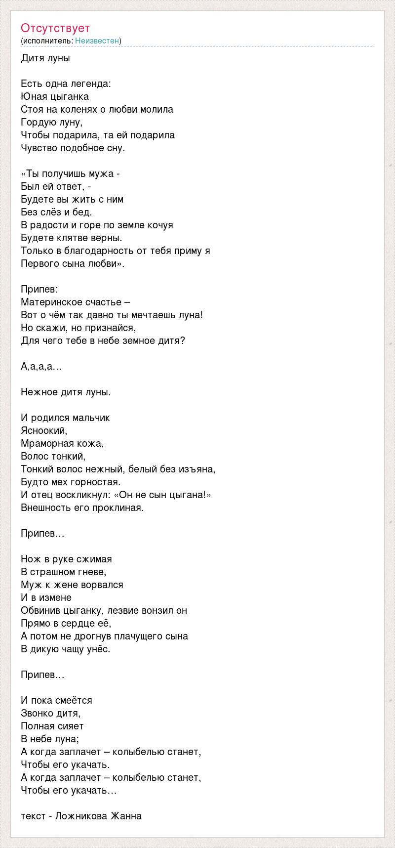 Дитя луны Есть одна легенда: Юная цыганка Стоя на коленях о любви молила Гордую луну, Чтобы подарила, та ей подарила Чувство подобное сну. «Ты получишь мужа - Был ей ответ, - Будете вы жить с ним Без слёз и бед. В радости и горе по земле кочуя Будете клятве верны. Только в благодарность от тебя приму я Первого сына любви». Припев: Материнское счастье – Вот о чём так давно ты мечтаешь луна! Но скажи, но признайся, Для чего тебе в небе земное дитя? А,а,а,а… Нежное дитя луны. И родился мальчик Ясноокий, Мраморная кожа, Волос тонкий, Тонкий волос нежный, белый без изъяна, Будто мех горностая. И отец воскликнул: «Он не сын цыгана!» Внешность его проклиная. Припев… Нож в руке сжимая В страшном гневе, Муж к жене ворвался И в измене Обвинив цыганку, лезвие вонзил он Прямо в сердце её, А потом не дрогнув плачущего сына В дикую чащу унёс. Припев… И пока смеётся Звонко дитя, Полная сияет В небе луна; А когда заплачет – колыбелью станет, Чтобы его укачать. А когда заплачет – колыбелью станет, Чтобы его укачать… текст - Ложникова Жанна