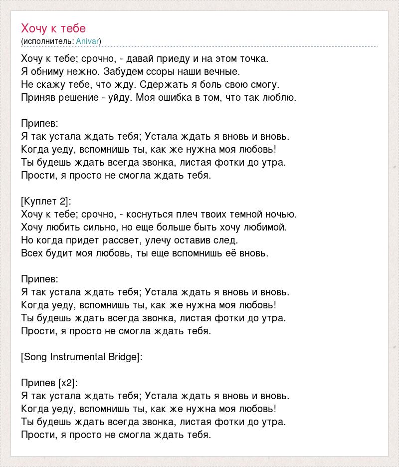 Хочу к тебе; срочно, - давай приеду и на этом точка. Я обниму нежно. Забудем ссоры наши вечные. Не скажу тебе, что жду. Сдержать я боль свою смогу. Приняв решение - уйду. Моя ошибка в том, что так люблю. Припев: Я так устала ждать тебя; Устала ждать я вновь и вновь. Когда уеду, вспомнишь ты, как же нужна моя любовь! Ты будешь ждать всегда звонка, листая фотки до утра. Прости, я просто не смогла ждать тебя. [Куплет 2]: Хочу к тебе; срочно, - коснуться плеч твоих темной ночью. Хочу любить сильно, но еще больше быть хочу любимой. Но когда придет рассвет, улечу оставив след. Всех будит моя любовь, ты еще вспомнишь её вновь. Припев: Я так устала ждать тебя; Устала ждать я вновь и вновь. Когда уеду, вспомнишь ты, как же нужна моя любовь! Ты будешь ждать всегда звонка, листая фотки до утра. Прости, я просто не смогла ждать тебя. [Song Instrumental Bridge]: Припев [x2]: Я так устала ждать тебя; Устала ждать я вновь и вновь. Когда уеду, вспомнишь ты, как же нужна моя любовь! Ты будешь ждать всегда звонка, листая фотки до утра. Прости, я просто не смогла ждать тебя.