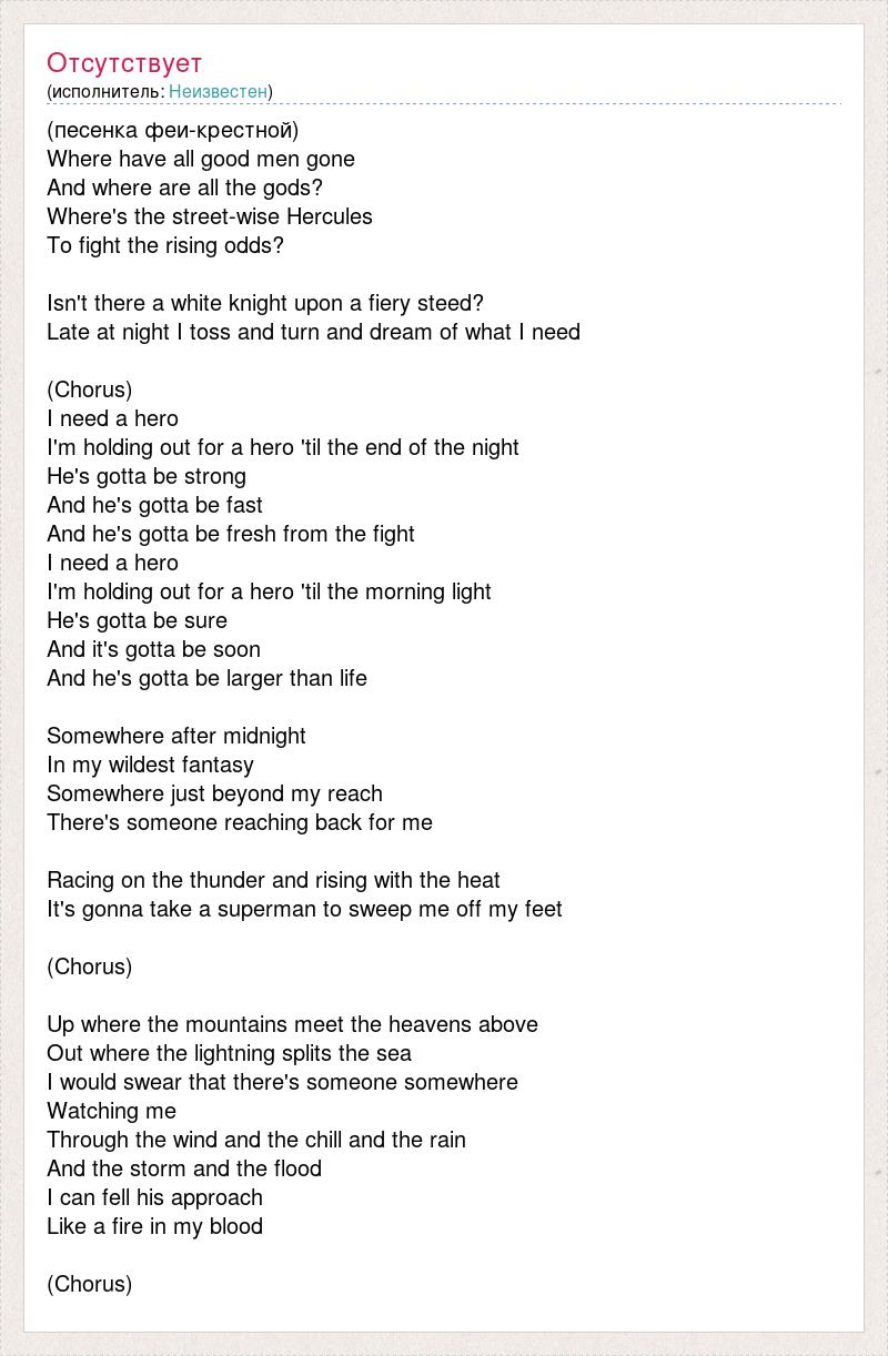 (песенка феи-крестной) Where have all good men gone And where are all the gods? Where's the street-wise Hercules To fight the rising odds? Isn't there a white knight upon a fiery steed? Late at night I toss and turn and dream of what I need (Chorus) I need a hero I'm holding out for a hero 'til the end of the night He's gotta be strong And he's gotta be fast And he's gotta be fresh from the fight I need a hero I'm holding out for a hero 'til the morning light He's gotta be sure And it's gotta be soon And he's gotta be larger than life Somewhere after midnight In my wildest fantasy Somewhere just beyond my reach There's someone reaching back for me Racing on the thunder and rising with the heat It's gonna take a superman to sweep me off my feet (Chorus) Up where the mountains meet the heavens above Out where the lightning splits the sea I would swear that there's someone somewhere Watching me Through the wind and the chill and the rain And the storm and the flood I can fell his approach Like a fire in my blood (Chorus)
