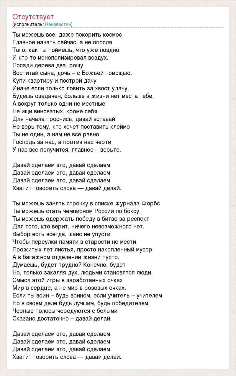 Ты можешь все, даже покорить космос Главное начать сейчас, а не опосля Того, как ты поймешь, что уже поздно И кто-то монополизировал воздух. Посади дерева два, рощу Воспитай сына, дочь – с Божьей помощью. Купи квартиру и построй дачу Иначе если только ловить за хвост удачу. Будешь озадачен, больше в жизни нет места тебе, А вокруг только одни не местные Не ищи виноватых, кроме себя. Для начала проснись, давай вставай Не верь тому, кто хочет поставить клеймо Ты не один, а нам не все равно Господь за нас, а против нас черти У нас все получится, главное – верьте. Давай сделаем это, давай сделаем Давай сделаем это, давай сделаем Давай сделаем это, давай сделаем Хватит говорить слова — давай делай. Ты можешь занять строчку в списке журнала Форбс Ты можешь стать чемпионом России по боксу. Ты можешь одержать победу в битве за респект Для того, кто верит, ничего невозможного нет. Выбор есть всегда, шанс не упусти Чтобы переулки памяти в старости не мести Прожитых лет листья, просто накопленный мусор А в багажном отделении жизни пусто. Думаешь, будет трудно? Конечно, будет Но, только закаляя дух, людьми становятся люди. Смысл этой игры в заработанных очках Мир в сердце, а не мир в розовых очках. Если ты воин – будь воином, если учитель – учителем Но в своем деле будь лучшим, будь победителем. Черные полосы чередуются с белыми Сказано достаточно – давай делай. Давай сделаем это, давай сделаем Давай сделаем это, давай сделаем Давай сделаем это, давай сделаем Хватит говорить слова — давай делай.