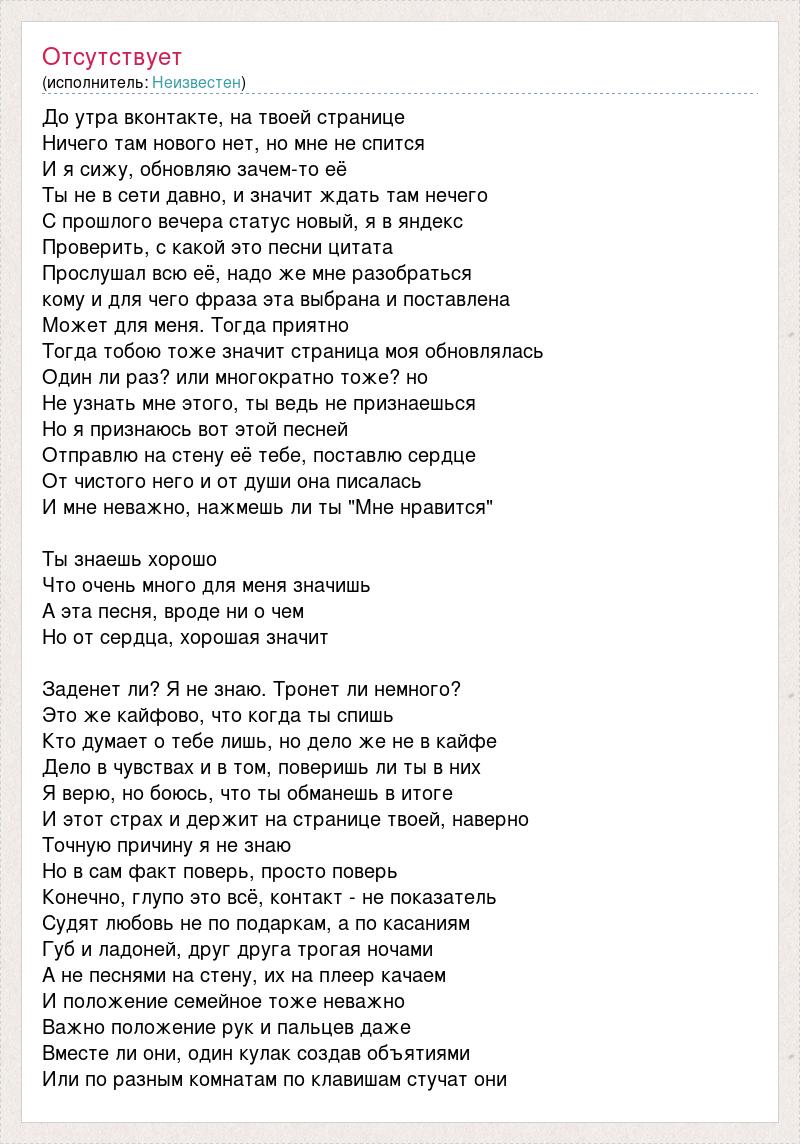 До утра вконтакте, на твоей странице Ничего там нового нет, но мне не спится И я сижу, обновляю зачем-то её Ты не в сети давно, и значит ждать там нечего С прошлого вечера статус новый, я в яндекс Проверить, с какой это песни цитата Прослушал всю её, надо же мне разобраться кому и для чего фраза эта выбрана и поставлена Может для меня. Тогда приятно Тогда тобою тоже значит страница моя обновлялась Один ли раз? или многократно тоже? но Не узнать мне этого, ты ведь не признаешься Но я признаюсь вот этой песней Отправлю на стену её тебе, поставлю сердце От чистого него и от души она писалась И мне неважно, нажмешь ли ты "Мне нравится" Ты знаешь хорошо Что очень много для меня значишь А эта песня, вроде ни о чем Но от сердца, хорошая значит Заденет ли? Я не знаю. Тронет ли немного? Это же кайфово, что когда ты спишь Кто думает о тебе лишь, но дело же не в кайфе Дело в чувствах и в том, поверишь ли ты в них Я верю, но боюсь, что ты обманешь в итоге И этот страх и держит на странице твоей, наверно Точную причину я не знаю Но в сам факт поверь, просто поверь Конечно, глупо это всё, контакт - не показатель Судят любовь не по подаркам, а по касаниям Губ и ладоней, друг друга трогая ночами А не песнями на стену, их на плеер качаем И положение семейное тоже неважно Важно положение рук и пальцев даже Вместе ли они, один кулак создав объятиями Или по разным комнатам по клавишам стучат они