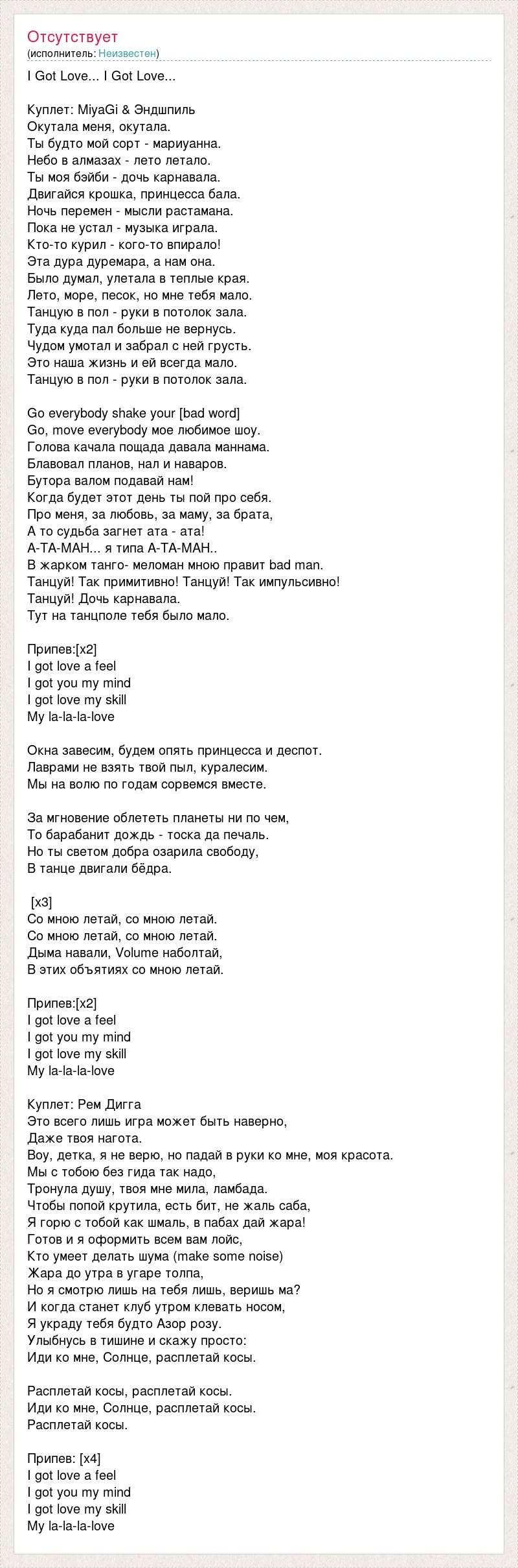 I Got Love... I Got Love... Куплет: MiyaGi & Эндшпиль Окутала меня, окутала. Ты будто мой сорт - мариуанна. Небо в алмазах - лето летало. Ты моя бэйби - дочь карнавала. Двигайся крошка, принцесса бала. Ночь перемен - мысли растамана. Пока не устал - музыка играла. Кто-то курил - кого-то впирало! Эта дура дуремара, а нам она. Было думал, улетала в теплые края. Лето, море, песок, но мне тебя мало. Танцую в пол - руки в потолок зала. Туда куда пал больше не вернусь. Чудом умотал и забрал с ней грусть. Это наша жизнь и ей всегда мало. Танцую в пол - руки в потолок зала. Go everybody shake your [bad word] Go, move everybody мое любимое шоу. Голова качала пощада давала маннама. Блавовал планов, нал и наваров. Бутора валом подавай нам! Когда будет этот день ты пой про себя. Про меня, за любовь, за маму, за брата, А то судьба загнет ата - ата! А-ТА-МАН... я типа А-ТА-МАН.. В жарком танго- меломан мною правит bad man. Танцуй! Так примитивно! Танцуй! Так импульсивно! Танцуй! Дочь карнавала. Тут на танцполе тебя было мало. Припев:[x2] I got love a feel I got you my mind I got love my skill My la-la-la-love Окна завесим, будем опять принцесса и деспот. Лаврами не взять твой пыл, куралесим. Мы на волю по годам сорвемся вместе. За мгновение облететь планеты ни по чем, То барабанит дождь - тоска да печаль. Но ты светом добра озарила свободу, В танце двигали бёдра. [х3] Со мною летай, со мною летай. Со мною летай, со мною летай. Дыма навали, Volume наболтай, В этих объятиях со мною летай. Припев:[х2] I got love a feel I got you my mind I got love my skill My la-la-la-love Куплет: Рем Дигга Это всего лишь игра может быть наверно, Даже твоя нагота. Воу, детка, я не верю, но падай в руки ко мне, моя красота. Мы с тобою без гида так надо, Тронула душу, твоя мне мила, ламбада. Чтобы попой крутила, есть бит, не жаль саба, Я горю с тобой как шмаль, в пабах дай жара! Готов и я оформить всем вам лойс, Кто умеет делать шума (make some noise) Жара до утра в угаре толпа, Но я смотрю лишь на тебя лишь, веришь ма? И когда станет клуб утром клевать носом, Я украду тебя будто Азор розу. Улыбнусь в тишине и скажу просто: Иди ко мне, Солнце, расплетай косы. Расплетай косы, расплетай косы. Иди ко мне, Солнце, расплетай косы. Расплетай косы. Припев: [x4] I got love a feel I got you my mind I got love my skill My la-la-la-love