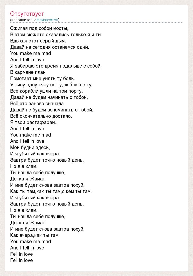 Сжигая под собой мосты, В этом сюжете оказались только я и ты. Вдыхая этот серый дым. Давай на сегодня останемся одни. You make me mad And I fell in love Я забираю это время подальше с собой, В кармане план Помогает мне унять ту боль. Я тяну одну,тяну не ту,люблю не ту. Все корабли ушли на том порту. Давай не будем начинать с тобой, Всё это заново,сначала. Давай не будем вспоминать с тобой, Всё окончательно достало. Я твой растафарай.. And I fell in love You make me mad And I fell in love Мои будни здесь, И я убитый как вчера. Завтра будет точно новый день, Но я в хлам. Ты нашла себе получше, Детка я Жаман. И мне будет снова завтра похуй, Как ты там,как ты там,с кем ты там. И я убитый как вчера. Завтра будет точно новый день, Но я в хлам. Ты нашла себе получше, Детка я Жаман И мне будет снова завтра похуй, Как вчера,как ты там. You make me mad And I fell in love Fell in love Fell in love