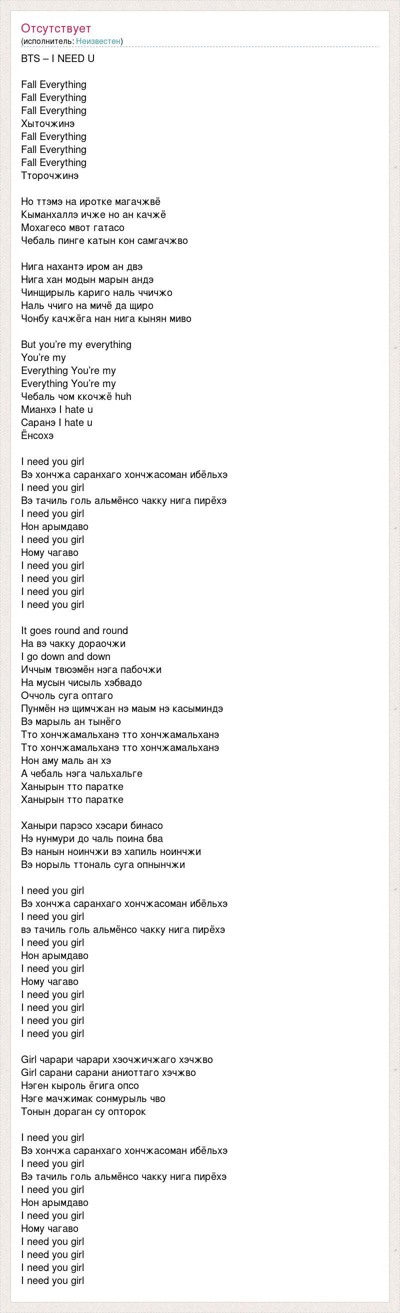 BTS – I NEED U Fall Everything Fall Everything Fall Everything Хыточжинэ Fall Everything Fall Everything Fall Everything Тторочжинэ Но ттэмэ на иротке магачжвё Кыманхаллэ ичже но ан качжё Мохагесо мвот гатасо Чебаль пинге катын кон самгачжво Нига нахантэ иром ан двэ Нига хан модын марын андэ Чинщирыль кариго наль ччичжо Наль ччиго на мичё да щиро Чонбу качжёга нан нига кынян миво But you’re my everything You’re my Everything You’re my Everything You’re my Чебаль чом ккочжё huh Мианхэ I hate u Саранэ I hate u Ёнсохэ I need you girl Вэ хончжа саранхаго хончжасоман ибёльхэ I need you girl Вэ тачиль голь альмёнсо чакку нига пирёхэ I need you girl Нон арымдаво I need you girl Ному чагаво I need you girl I need you girl I need you girl I need you girl It goes round and round На вэ чакку дораочжи I go down and down Иччым твюэмён нэга пабочжи На мусын чисыль хэбвадо Оччоль суга оптаго Пунмён нэ щимчжан нэ маым нэ касыминдэ Вэ марыль ан тынёго Тто хончжамальханэ тто хончжамальханэ Тто хончжамальханэ тто хончжамальханэ Нон аму маль ан хэ А чебаль нэга чальхальге Ханырын тто паратке Ханырын тто паратке Ханыри парэсо хэсари бинасо Нэ нунмури до чаль поина бва Вэ нанын ноинчжи вэ хапиль ноинчжи Вэ норыль ттональ суга опнынчжи I need you girl Вэ хончжа саранхаго хончжасоман ибёльхэ I need you girl вэ тачиль голь альмёнсо чакку нига пирёхэ I need you girl Нон арымдаво I need you girl Ному чагаво I need you girl I need you girl I need you girl I need you girl Girl чарари чарари хэочжичжаго хэчжво Girl сарани сарани аниоттаго хэчжво Нэген кыроль ёгига опсо Нэге мачжимак сонмурыль чво Тонын дораган су опторок I need you girl Вэ хончжа саранхаго хончжасоман ибёльхэ I need you girl Вэ тачиль голь альмёнсо чакку нига пирёхэ I need you girl Нон арымдаво I need you girl Ному чагаво I need you girl I need you girl I need you girl I need you girl