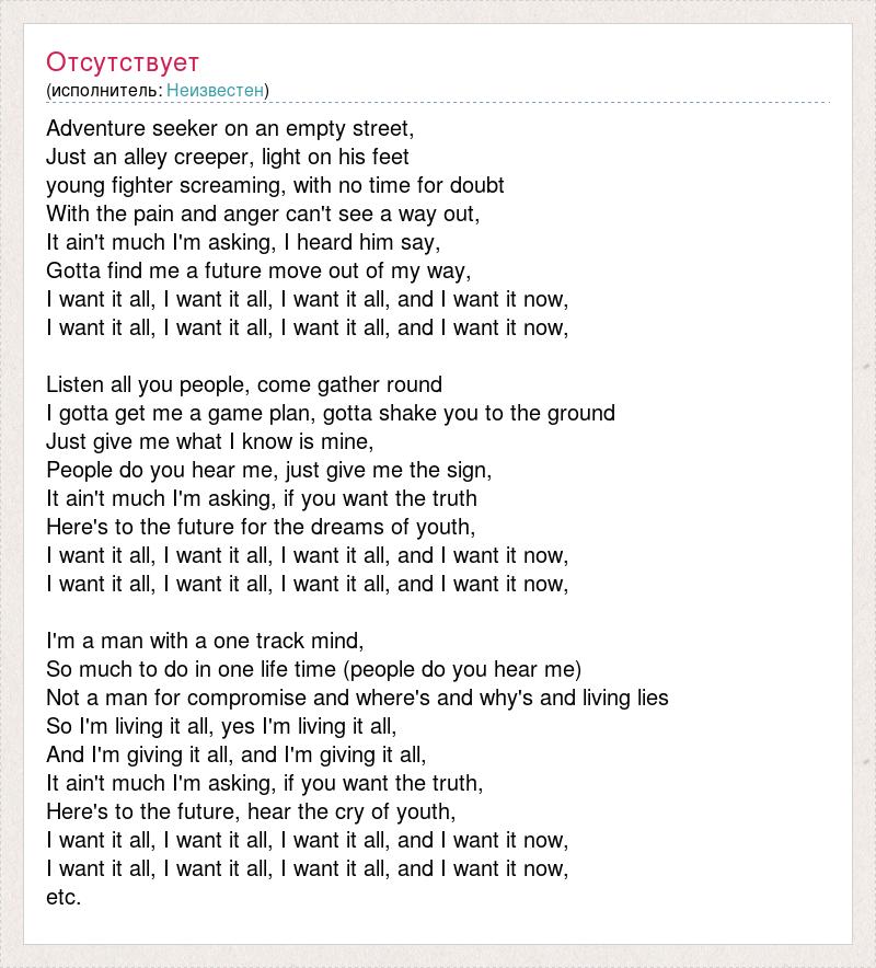 Adventure seeker on an empty street, Just an alley creeper, light on his feet young fighter screaming, with no time for doubt With the pain and anger can't see a way out, It ain't much I'm asking, I heard him say, Gotta find me a future move out of my way, I want it all, I want it all, I want it all, and I want it now, I want it all, I want it all, I want it all, and I want it now, Listen all you people, come gather round I gotta get me a game plan, gotta shake you to the ground Just give me what I know is mine, People do you hear me, just give me the sign, It ain't much I'm asking, if you want the truth Here's to the future for the dreams of youth, I want it all, I want it all, I want it all, and I want it now, I want it all, I want it all, I want it all, and I want it now, I'm a man with a one track mind, So much to do in one life time (people do you hear me) Not a man for compromise and where's and why's and living lies So I'm living it all, yes I'm living it all, And I'm giving it all, and I'm giving it all, It ain't much I'm asking, if you want the truth, Here's to the future, hear the cry of youth, I want it all, I want it all, I want it all, and I want it now, I want it all, I want it all, I want it all, and I want it now, etc.