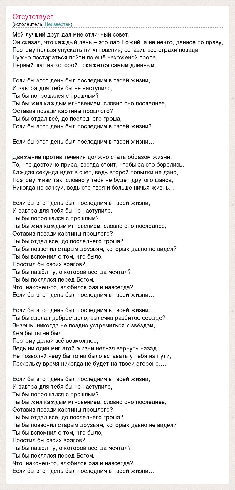 Мой лучший друг дал мне отличный совет. Он сказал, что каждый день – это дар Божий, а не нечто, данное по праву, Поэтому нельзя упускать ни мгновения, оставив все страхи позади. Нужно постараться пойти по ещё нехоженой тропе, Первый шаг на которой покажется самым длинным. Если бы этот день был последним в твоей жизни, И завтра для тебя бы не наступило, Ты бы попрощался с прошлым? Ты бы жил каждым мгновением, словно оно последнее, Оставив позади картины прошлого? Ты бы отдал всё, до последнего гроша, Если бы этот день был последним в твоей жизни? Если бы этот день был последним в твоей жизни… Движение против течения должно стать образом жизни: То, что достойно приза, всегда стоит, чтобы за это боролись. Каждая секунда идёт в счёт, ведь второй попытки не дано, Поэтому живи так, словно у тебя не будет другого шанса, Никогда не сачкуй, ведь это твоя и больше ничья жизнь… Если бы этот день был последним в твоей жизни, И завтра для тебя бы не наступило, Ты бы попрощался с прошлым? Ты бы жил каждым мгновением, словно оно последнее, Оставив позади картины прошлого? Ты бы отдал всё, до последнего гроша? Ты бы позвонил старым друзьям, которых давно не видел? Ты бы вспомнил о том, что было, Простил бы своих врагов? Ты бы нашёл ту, о которой всегда мечтал? Ты бы поклялся перед Богом, Что, наконец-то, влюбился раз и навсегда? Если бы этот день был последним в твоей жизни… Если бы этот день был последним в твоей жизни… Ты бы сделал доброе дело, вылечив разбитое сердце? Знаешь, никогда не поздно устремиться к звёздам, Кем бы ты ни был… Поэтому делай всё возможное, Ведь ни один миг этой жизни нельзя вернуть назад… Не позволяй чему бы то ни было вставать у тебя на пути, Поскольку время никогда не будет на твоей стороне…. Если бы этот день был последним в твоей жизни, И завтра для тебя бы не наступило, Ты бы попрощался с прошлым? Ты бы жил каждым мгновением, словно оно последнее, Оставив позади картины прошлого? Ты бы отдал всё, до последнего гроша? Ты бы позвонил старым друзьям, которых давно не видел? Ты бы вспомнил о том, что было, Простил бы своих врагов? Ты бы нашёл ту, о которой всегда мечтал? Ты бы поклялся перед Богом, Что, наконец-то, влюбился раз и навсегда? Если бы этот день был последним в твоей жизни…