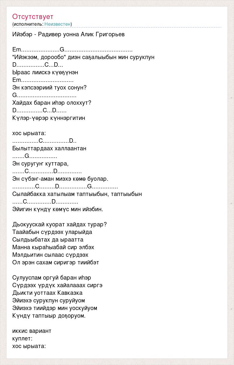 Ийэбэр - Радивер уонна Алик Григорьев Em......................G....................................... "Ийэкээм, дорообо" диэн саҕалыыбын мин сурукпун D................C...D... Ыраас лиискэ күөҕүнэн Em.............................. Эн кэпсээриий туох сонун? G.................................. Хайдах баран иhэр олоххут? D...............C...D...... Күлэр-үөрэр күннэргитин хос ырыата: ...............C...............D.. Былыттардаах халлаантан .......G................ Эн суругуҥ куттара, .......C..............D.............. Эн сүбэҥ-аман миэхэ көмө буолар. .............C.........D................G............... Сылайбакка хатылыам таптыыбын, таптыыбын ......C..............D............. Эйигин күндү көмүс мин ийэбин. Дьокуускай куорат хайдах турар? Таайабын сүрдээх уларыйда Сылдьыбатах да ыраатта Манна кыраhыабай сир элбэх Мэлдьитин сылаас сүрдээх Ол эрэн сахам сиригэр тиийбэт Сулууспам оргуй баран иhэр Сүрдээх үрдүк хайалааах сиргэ Дьикти уоттаах Кавказка Эйиэхэ сурукпун суруйуом Эйиэхэ тиийдэр мин уоскуйуом Күндү таптыыр доҕоруом. иккис вариант куплет: хос ырыата: