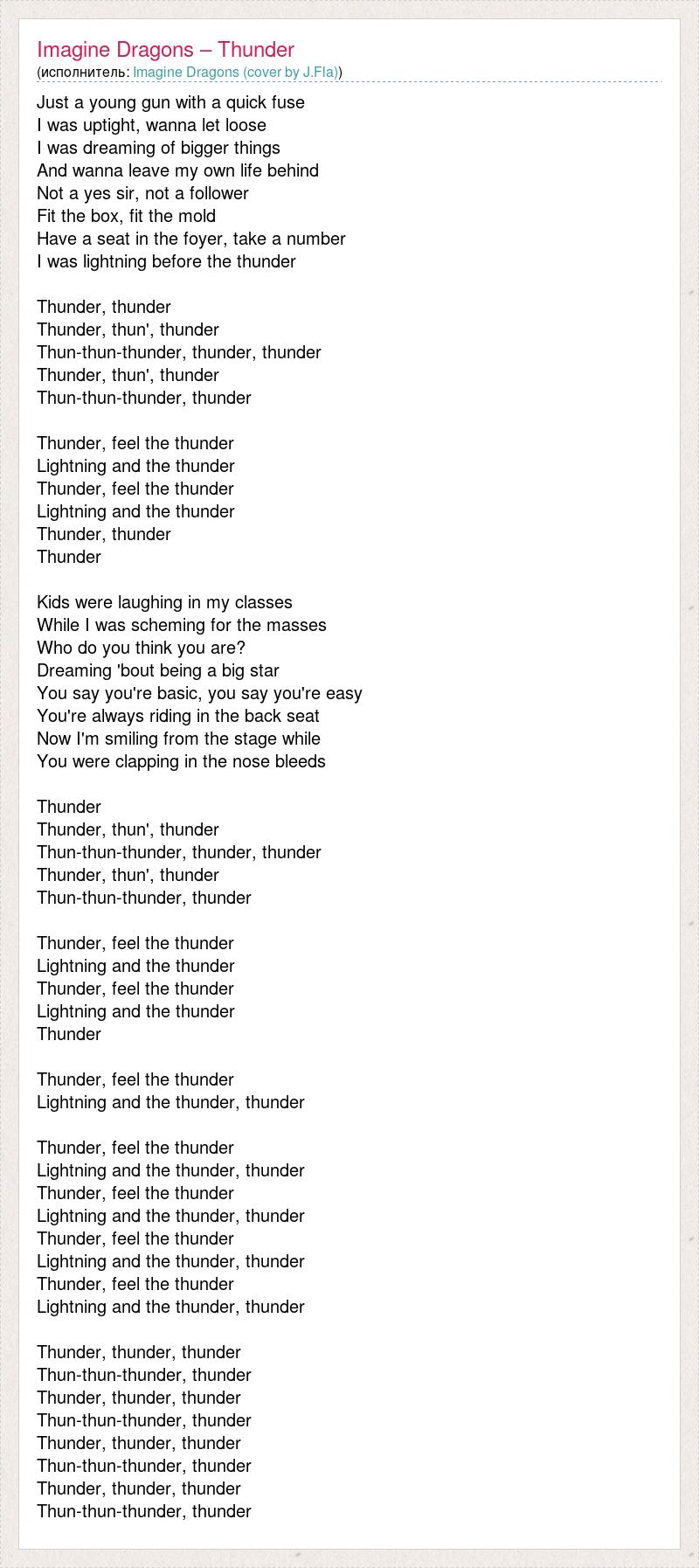 Just a young gun with a quick fuse I was uptight, wanna let loose I was dreaming of bigger things And wanna leave my own life behind Not a yes sir, not a follower Fit the box, fit the mold Have a seat in the foyer, take a number I was lightning before the thunder Thunder, thunder Thunder, thun', thunder Thun-thun-thunder, thunder, thunder Thunder, thun', thunder Thun-thun-thunder, thunder Thunder, feel the thunder Lightning and the thunder Thunder, feel the thunder Lightning and the thunder Thunder, thunder Thunder Kids were laughing in my classes While I was scheming for the masses Who do you think you are? Dreaming 'bout being a big star You say you're basic, you say you're easy You're always riding in the back seat Now I'm smiling from the stage while You were clapping in the nose bleeds Thunder Thunder, thun', thunder Thun-thun-thunder, thunder, thunder Thunder, thun', thunder Thun-thun-thunder, thunder Thunder, feel the thunder Lightning and the thunder Thunder, feel the thunder Lightning and the thunder Thunder Thunder, feel the thunder Lightning and the thunder, thunder Thunder, feel the thunder Lightning and the thunder, thunder Thunder, feel the thunder Lightning and the thunder, thunder Thunder, feel the thunder Lightning and the thunder, thunder Thunder, feel the thunder Lightning and the thunder, thunder Thunder, thunder, thunder Thun-thun-thunder, thunder Thunder, thunder, thunder Thun-thun-thunder, thunder Thunder, thunder, thunder Thun-thun-thunder, thunder Thunder, thunder, thunder Thun-thun-thunder, thunder