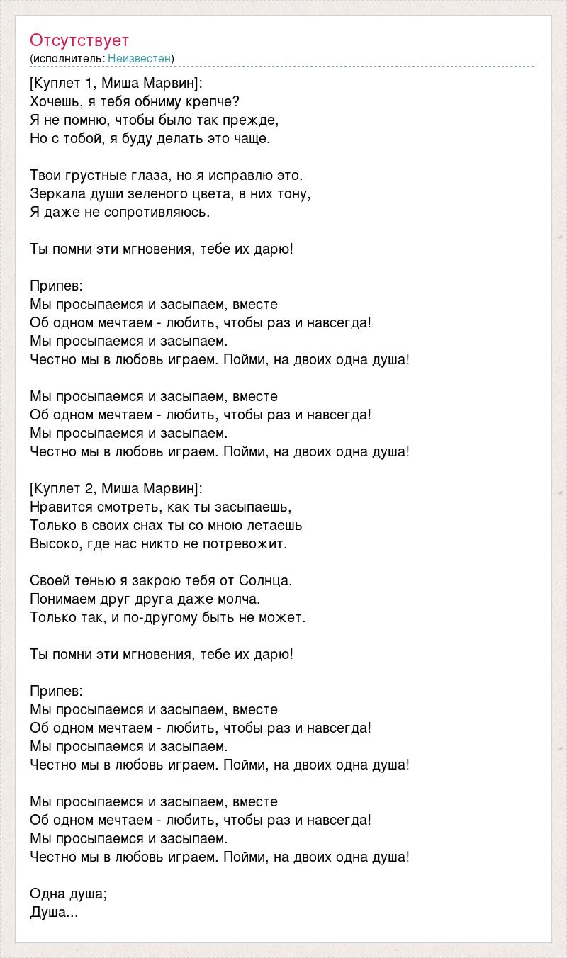 [Куплет 1, Миша Марвин]: Хочешь, я тебя обниму крепче? Я не помню, чтобы было так прежде, Но с тобой, я буду делать это чаще. Твои грустные глаза, но я исправлю это. Зеркала души зеленого цвета, в них тону, Я даже не сопротивляюсь. Ты помни эти мгновения, тебе их дарю! Припев: Мы просыпаемся и засыпаем, вместе Об одном мечтаем - любить, чтобы раз и навсегда! Мы просыпаемся и засыпаем. Честно мы в любовь играем. Пойми, на двоих одна душа! Мы просыпаемся и засыпаем, вместе Об одном мечтаем - любить, чтобы раз и навсегда! Мы просыпаемся и засыпаем. Честно мы в любовь играем. Пойми, на двоих одна душа! [Куплет 2, Миша Марвин]: Нравится смотреть, как ты засыпаешь, Только в своих снах ты со мною летаешь Высоко, где нас никто не потревожит. Своей тенью я закрою тебя от Солнца. Понимаем друг друга даже молча. Только так, и по-другому быть не может. Ты помни эти мгновения, тебе их дарю! Припев: Мы просыпаемся и засыпаем, вместе Об одном мечтаем - любить, чтобы раз и навсегда! Мы просыпаемся и засыпаем. Честно мы в любовь играем. Пойми, на двоих одна душа! Мы просыпаемся и засыпаем, вместе Об одном мечтаем - любить, чтобы раз и навсегда! Мы просыпаемся и засыпаем. Честно мы в любовь играем. Пойми, на двоих одна душа! Одна душа; Душа...