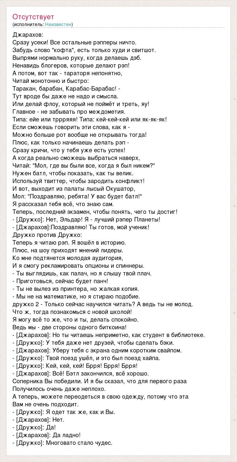 Джарахов: Сразу усеки! Все остальные рэпперы ничто. Забудь слово "кофта", есть только худи и свитшот. Выпрями нормально руку, когда делаешь дэб. Ненавидь блогеров, которые делают рэп! А потом, вот так - тараторя непонятно, Читай монотонно и быстро: Таракан, барабан, Карабас-Барабас! - Тут вроде бы даже не надо и смысла. Или делай флоу, который не поймёт и треть, яу! Главное - не забывать про междометия. Типа: ейе или тррряяя! Типа: кей-кей-кей или як-як-як! Если сможешь говорить эти слова, как я - Можно больше рот вообще не открывать тогда! Плюс, как только начинаешь делать рэп - Сразу кричи, что у тебя уже есть успех! А когда реально сможешь выбраться наверх, Читай: "Мол, где вы были все, когда я был никем?" Нужен батл, чтобы показать, как ты велик. Используй твиттер, чтобы зародить конфликт! И вот, выходит из палаты лысый Окушатор, Мол: "Поздравляю, ребята! У вас будет батл!" Я рассказал тебя всё, что знаю сам. Теперь, последний экзамен, чтобы понять, чего ты достиг! - [Дружко]: Нет, Эльдар! Я - лучший рэпер Планеты! - [Джарахов]:Поздравляю! Ты готов, мой ученик! Дружко против Дружко: Теперь я читаю рэп. Я вошёл в историю. Плюс, на шоу приходят мнений лидеры. Ко мне подтянется молодая аудитория, И я смогу рекламировать опционы и спиннеры. - Ты выглядишь, как палач, но я слышу твой плач. - Приготовься, сейчас будет панч! - Ты не вылез из принтера, но жалкая копия. - Мы не на математике, но я стираю подобие. дружко 2 - Только сейчас научился читать? А ведь ты не молод. Что ж, тогда познакомься с новой школой! Я могу всё то же, что и ты, делать спокойно. Ведь мы - две стороны одного биткоина! - [Джарахов]: Но ты читаешь неприметно, как студент в библиотеке. - [Дружко]: У тебя даже нет друзей, чтобы сделать бэки. - [Джарахов]: Уберу тебя с экрана одним коротким свайпом. - [Дружко]: Твой поезд ушёл, и это был поезд хайпа. - [Дружко]: Кей, кей, кей! Брря! Брря! Брря! - [Джарахов]: Всё! Бэтл закончился, всё хорошо. Соперника Вы победили. И я бы сказал, что для первого раза Получилось очень даже неплохо. А теперь, можете переодеться в свою одежду, потому что эта Вам не очень подходит. - [Дружко]: Я одет так же, как и Вы. - [Джарахов]: Нет. - [Дружко]: Да! - [Джарахов]: Да ладно! - [Дружко]: Многовато стало чудес.