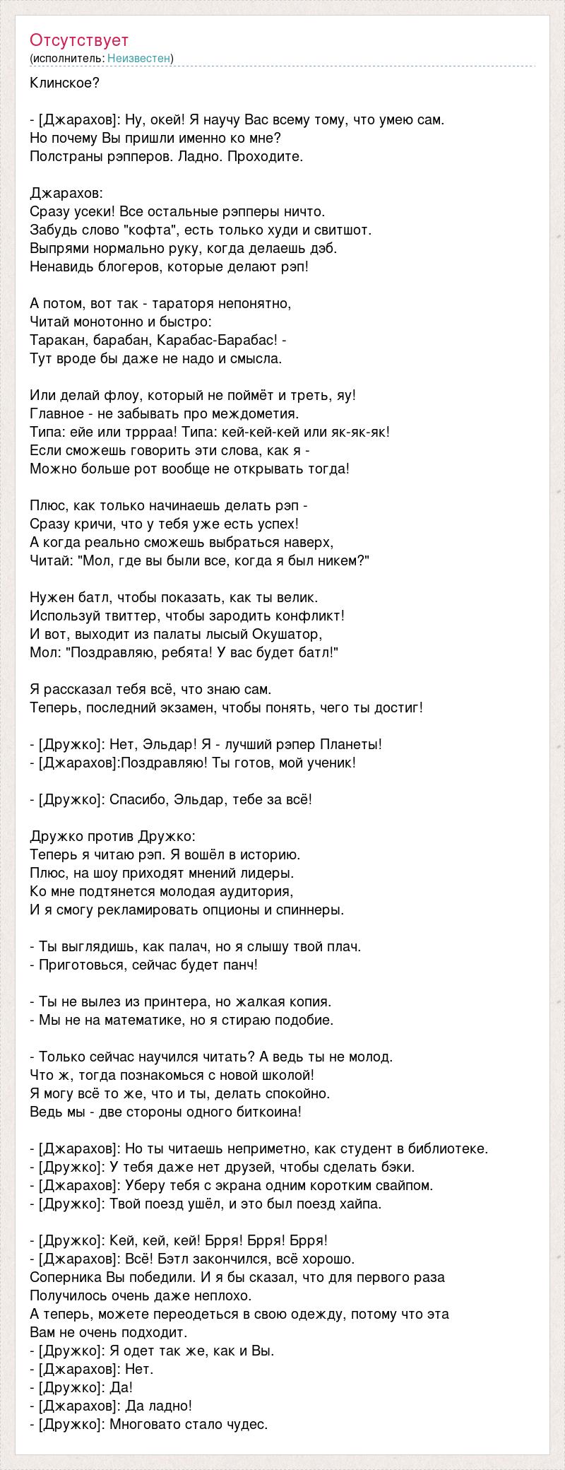Клинское? - [Джарахов]: Ну, окей! Я научу Вас всему тому, что умею сам. Но почему Вы пришли именно ко мне? Полстраны рэпперов. Ладно. Проходите. Джарахов: Сразу усеки! Все остальные рэпперы ничто. Забудь слово "кофта", есть только худи и свитшот. Выпрями нормально руку, когда делаешь дэб. Ненавидь блогеров, которые делают рэп! А потом, вот так - тараторя непонятно, Читай монотонно и быстро: Таракан, барабан, Карабас-Барабас! - Тут вроде бы даже не надо и смысла. Или делай флоу, который не поймёт и треть, яу! Главное - не забывать про междометия. Типа: ейе или тррраа! Типа: кей-кей-кей или як-як-як! Если сможешь говорить эти слова, как я - Можно больше рот вообще не открывать тогда! Плюс, как только начинаешь делать рэп - Сразу кричи, что у тебя уже есть успех! А когда реально сможешь выбраться наверх, Читай: "Мол, где вы были все, когда я был никем?" Нужен батл, чтобы показать, как ты велик. Используй твиттер, чтобы зародить конфликт! И вот, выходит из палаты лысый Окушатор, Мол: "Поздравляю, ребята! У вас будет батл!" Я рассказал тебя всё, что знаю сам. Теперь, последний экзамен, чтобы понять, чего ты достиг! - [Дружко]: Нет, Эльдар! Я - лучший рэпер Планеты! - [Джарахов]:Поздравляю! Ты готов, мой ученик! - [Дружко]: Спасибо, Эльдар, тебе за всё! Дружко против Дружко: Теперь я читаю рэп. Я вошёл в историю. Плюс, на шоу приходят мнений лидеры. Ко мне подтянется молодая аудитория, И я смогу рекламировать опционы и спиннеры. - Ты выглядишь, как палач, но я слышу твой плач. - Приготовься, сейчас будет панч! - Ты не вылез из принтера, но жалкая копия. - Мы не на математике, но я стираю подобие. - Только сейчас научился читать? А ведь ты не молод. Что ж, тогда познакомься с новой школой! Я могу всё то же, что и ты, делать спокойно. Ведь мы - две стороны одного биткоина! - [Джарахов]: Но ты читаешь неприметно, как студент в библиотеке. - [Дружко]: У тебя даже нет друзей, чтобы сделать бэки. - [Джарахов]: Уберу тебя с экрана одним коротким свайпом. - [Дружко]: Твой поезд ушёл, и это был поезд хайпа. - [Дружко]: Кей, кей, кей! Брря! Брря! Брря! - [Джарахов]: Всё! Бэтл закончился, всё хорошо. Соперника Вы победили. И я бы сказал, что для первого раза Получилось очень даже неплохо. А теперь, можете переодеться в свою одежду, потому что эта Вам не очень подходит. - [Дружко]: Я одет так же, как и Вы. - [Джарахов]: Нет. - [Дружко]: Да! - [Джарахов]: Да ладно! - [Дружко]: Многовато стало чудес.
