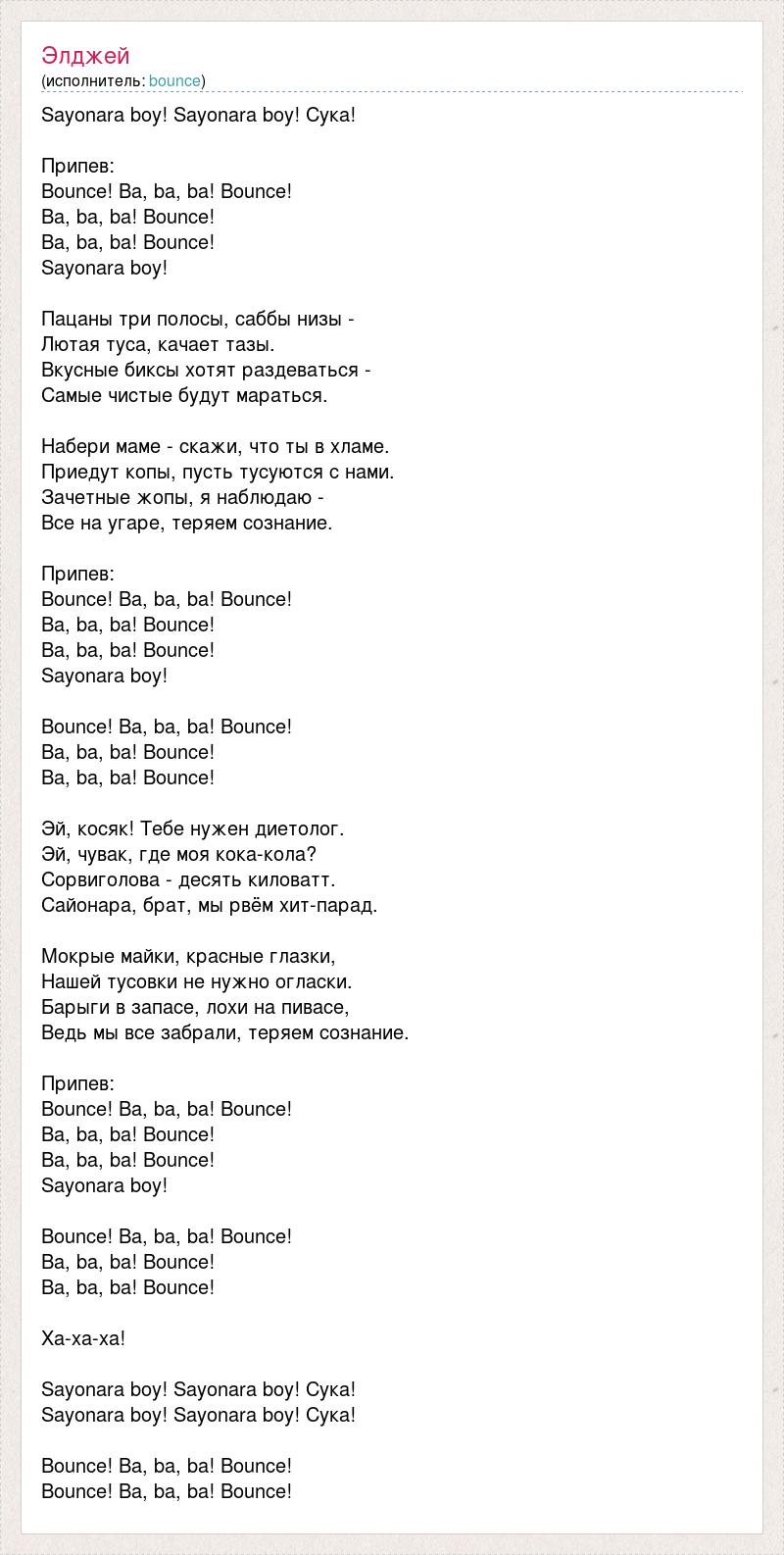 Sayonara boy! Sayonara boy! Сука! Припев: Bounce! Ba, ba, ba! Bounce! Ba, ba, ba! Bounce! Ba, ba, ba! Bounce! Sayonara boy! Пацаны три полосы, саббы низы - Лютая туса, качает тазы. Вкусные биксы хотят раздеваться - Самые чистые будут мараться. Набери маме - скажи, что ты в хламе. Приедут копы, пусть тусуются с нами. Зачетные жопы, я наблюдаю - Все на угаре, теряем сознание. Припев: Bounce! Ba, ba, ba! Bounce! Ba, ba, ba! Bounce! Ba, ba, ba! Bounce! Sayonara boy! Bounce! Ba, ba, ba! Bounce! Ba, ba, ba! Bounce! Ba, ba, ba! Bounce! Эй, косяк! Тебе нужен диетолог. Эй, чувак, где моя кока-кола? Сорвиголова - десять киловатт. Сайонара, брат, мы рвём хит-парад. Мокрые майки, красные глазки, Нашей тусовки не нужно огласки. Барыги в запасе, лохи на пивасе, Ведь мы все забрали, теряем сознание. Припев: Bounce! Ba, ba, ba! Bounce! Ba, ba, ba! Bounce! Ba, ba, ba! Bounce! Sayonara boy! Bounce! Ba, ba, ba! Bounce! Ba, ba, ba! Bounce! Ba, ba, ba! Bounce! Ха-ха-ха! Sayonara boy! Sayonara boy! Сука! Sayonara boy! Sayonara boy! Сука! Bounce! Ba, ba, ba! Bounce! Bounce! Ba, ba, ba! Bounce!