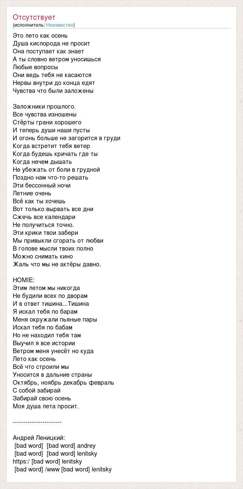Это лето как осень Душа кислорода не просит Она поступает как знает А ты словно ветром уносишься Любые вопросы Они ведь тебя не касаются Нервы внутри до конца едят Чувства что были заложены Заложники прошлого. Все чувства изношены Стёрты грани хорошего И теперь души наши пусты И огонь больше не загорится в груди Когда встретит тебя ветер Когда будешь кричать где ты Когда нечем дышать Не убежать от боли в грудной Поздно нам что-то решать Эти бессонный ночи Летние очень Всё как ты хочешь Вот только вырвать все дни Сжечь все календари Не получиться точно. Эти крики твои забери Мы привыкли сгорать от любви В голове мысли твоих полно Можно снимать кино Жаль что мы не актёры давно. HOMIE: Этим летом мы никогда Не будили всех по дворам И в ответ тишина...Тишина Я искал тебя по барам Меня окружали пьяные пары Искал тебя по бабам Но не находил тебя там Выучил я все истории Ветром меня унесёт но куда Лето как осень Всё что строили мы Уносится в дальние страны Октябрь, ноябрь декабрь февраль С собой забирай Забирай свою осень Моя душа лета просит. ----------------------- Андрей Леницкий: [bad word] [bad word] andrey [bad word] [bad word] lenitsky https:/ [bad word] lenitsky [bad word] /www [bad word] lenitsky