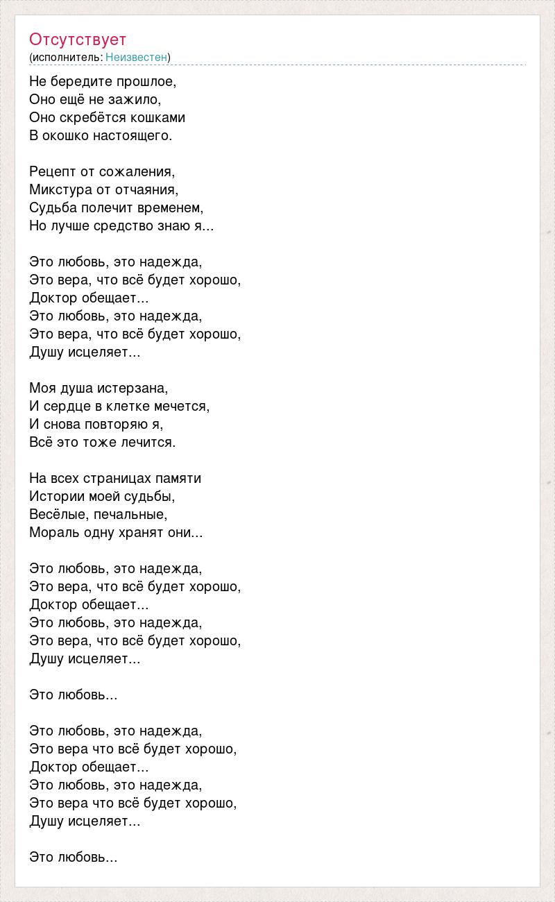 Не бередите прошлое, Оно ещё не зажило, Оно скребётся кошками В окошко настоящего. Рецепт от сожаления, Микстура от отчаяния, Судьба полечит временем, Но лучше средство знаю я... Это любовь, это надежда, Это вера, что всё будет хорошо, Доктор обещает... Это любовь, это надежда, Это вера, что всё будет хорошо, Душу исцеляет... Моя душа истерзана, И сердце в клетке мечется, И снова повторяю я, Всё это тоже лечится. На всех страницах памяти Истории моей судьбы, Весёлые, печальные, Мораль одну хранят они... Это любовь, это надежда, Это вера, что всё будет хорошо, Доктор обещает... Это любовь, это надежда, Это вера, что всё будет хорошо, Душу исцеляет... Это любовь... Это любовь, это надежда, Это вера что всё будет хорошо, Доктор обещает... Это любовь, это надежда, Это вера что всё будет хорошо, Душу исцеляет... Это любовь...