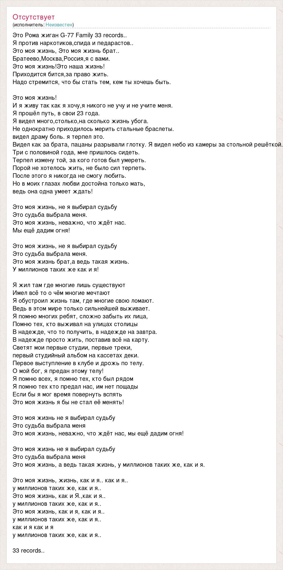 Это Рома жиган G-77 Family 33 records.. Я против наркотиков,спида и педарастов.. Это моя жизнь, Это моя жизнь брат.. Братеево,Москва,Россия,я с вами. Это моя жизнь!Это наша жизнь! Приходится бится,за право жить. Надо стремится, что бы стать тем, кем ты хочешь быть. Это моя жизнь! И я живу так как я хочу,я никого не учу и не учите меня. Я прошёл путь, в свои 23 года. Я видел много,столько,на сколько жизнь убога. Не однократно приходилось мерить стальные браслеты. видел драму боль. я терпел это. Видел как за брата, пацаны разрывали глотку. Я видел небо из камеры за стольной решёткой. Три с половиной года, мне пришлось сидеть. Терпел измену той, за кого готов был умереть. Порой не хотелось жить, не было сил терпеть. После этого я никогда не смогу любить. Но в моих глазах любви достойна только мать, ведь она одна умеет ждать! Это моя жизнь, не я выбирал судьбу Это судьба выбрала меня. Это моя жизнь, неважно, что ждёт нас. Мы ещё дадим огня! Это моя жизнь, не я выбирал судьбу Это судьба выбрала меня. Это моя жизнь брат,а ведь такая жизнь. У миллионов таких же как и я! Я жил там где многие лишь существуют Имел всё то о чём многие мечтают Я обустроил жизнь там, где многие свою ломают. Ведь в этом мире только сильнейшей выживает. Я помню многих ребят, сложно забыть их лица, Помню тех, кто выживал на улицах столицы В надежде, что то получить, в надежде на завтра. В надежде просто жить, поставив всё на карту. Светят мои первые студии, первые треки, первый студийный альбом на кассетах деки. Первое выступление в клубе и дрожь по телу. О мой бог, я предан этому телу! Я помню всех, я помню тех, кто был рядом Я помню тех кто предал нас, им нет пощады Если бы я мог время повернуть вспять Это моя жизнь я бы не стал её менять! Это моя жизнь не я выбирал судьбу Это судьба выбрала меня Это моя жизнь, неважно, что ждёт нас, мы ещё дадим огня! Это моя жизнь не я выбирал судьбу Это судьба выбрала меня Это моя жизнь, а ведь такая жизнь, у миллионов таких же, как и я. Это моя жизнь, жизнь, как и я.. как и я.. у миллионов таких же, как и я.. Это моя жизнь, как и Я.,как и я.. у миллионов таких же, как и я.. Это моя жизнь, как и я, как и я.. у миллионов таких же, как и я.. как и я как и я у миллионов таких же, как и я.. 33 records..