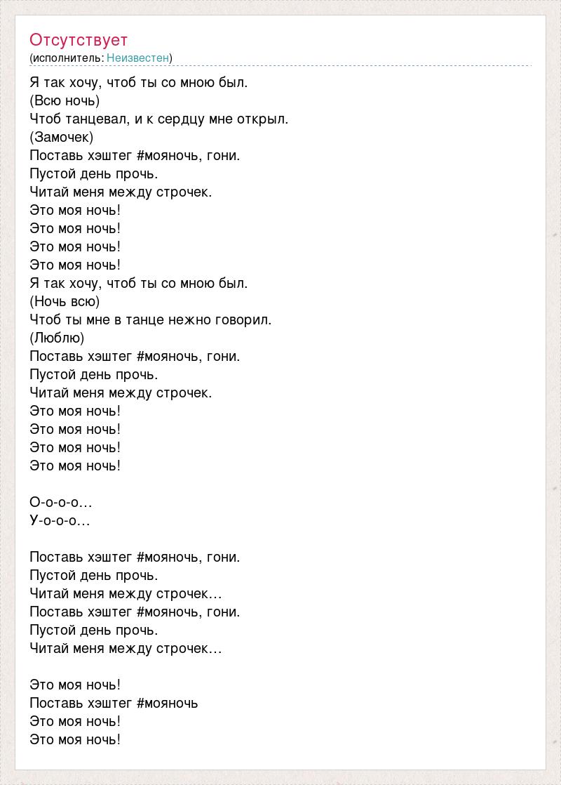Я так хочу, чтоб ты со мною был. (Всю ночь) Чтоб танцевал, и к сердцу мне открыл. (Замочек) Поставь хэштег #мояночь, гони. Пустой день прочь. Читай меня между строчек. Это моя ночь! Это моя ночь! Это моя ночь! Это моя ночь! Я так хочу, чтоб ты со мною был. (Ночь всю) Чтоб ты мне в танце нежно говорил. (Люблю) Поставь хэштег #мояночь, гони. Пустой день прочь. Читай меня между строчек. Это моя ночь! Это моя ночь! Это моя ночь! Это моя ночь! О-о-о-о… У-о-о-о… Поставь хэштег #мояночь, гони. Пустой день прочь. Читай меня между строчек… Поставь хэштег #мояночь, гони. Пустой день прочь. Читай меня между строчек… Это моя ночь! Поставь хэштег #мояночь Это моя ночь! Это моя ночь!