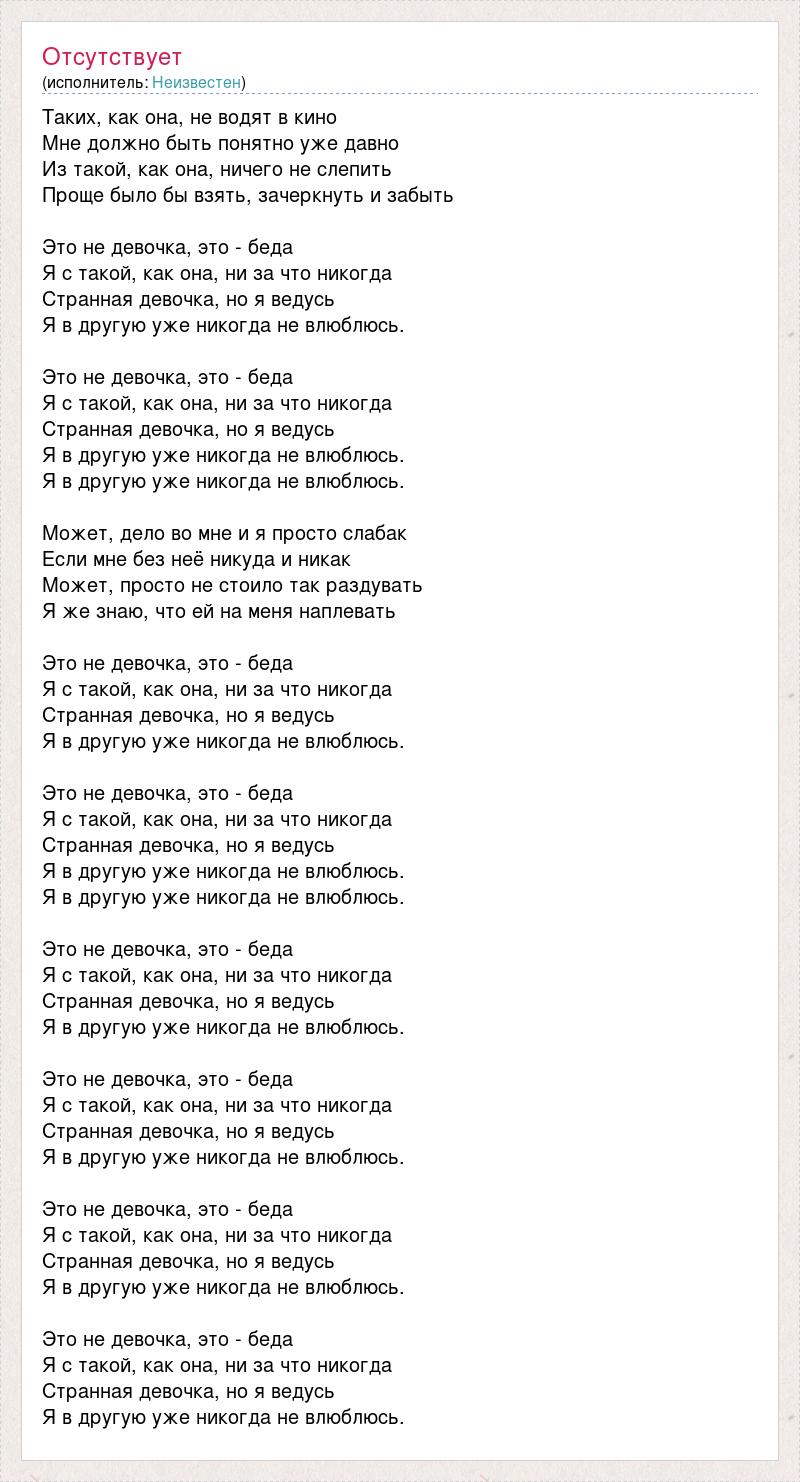 Таких, как она, не водят в кино Мне должно быть понятно уже давно Из такой, как она, ничего не слепить Проще было бы взять, зачеркнуть и забыть Это не девочка, это - беда Я с такой, как она, ни за что никогда Странная девочка, но я ведусь Я в другую уже никогда не влюблюсь. Это не девочка, это - беда Я с такой, как она, ни за что никогда Странная девочка, но я ведусь Я в другую уже никогда не влюблюсь. Я в другую уже никогда не влюблюсь. Может, дело во мне и я просто слабак Если мне без неё никуда и никак Может, просто не стоило так раздувать Я же знаю, что ей на меня наплевать Это не девочка, это - беда Я с такой, как она, ни за что никогда Странная девочка, но я ведусь Я в другую уже никогда не влюблюсь. Это не девочка, это - беда Я с такой, как она, ни за что никогда Странная девочка, но я ведусь Я в другую уже никогда не влюблюсь. Я в другую уже никогда не влюблюсь. Это не девочка, это - беда Я с такой, как она, ни за что никогда Странная девочка, но я ведусь Я в другую уже никогда не влюблюсь. Это не девочка, это - беда Я с такой, как она, ни за что никогда Странная девочка, но я ведусь Я в другую уже никогда не влюблюсь. Это не девочка, это - беда Я с такой, как она, ни за что никогда Странная девочка, но я ведусь Я в другую уже никогда не влюблюсь. Это не девочка, это - беда Я с такой, как она, ни за что никогда Странная девочка, но я ведусь Я в другую уже никогда не влюблюсь.