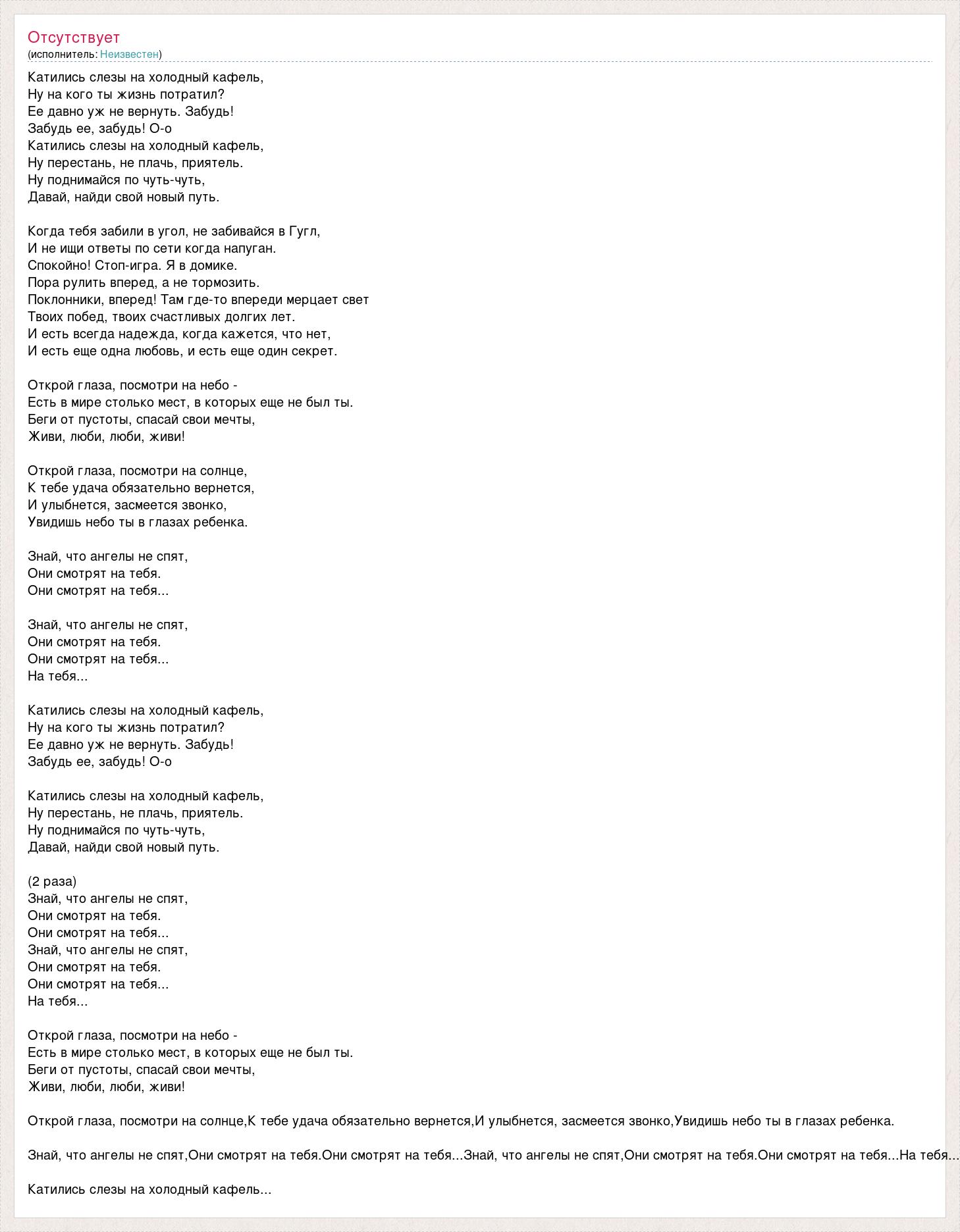 Катились слезы на холодный кафель, Ну на кого ты жизнь потратил? Ее давно уж не вернуть. Забудь! Забудь ее, забудь! О-о Катились слезы на холодный кафель, Ну перестань, не плачь, приятель. Ну поднимайся по чуть-чуть, Давай, найди свой новый путь. Когда тебя забили в угол, не забивайся в Гугл, И не ищи ответы по сети когда напуган. Спокойно! Стоп-игра. Я в домике. Пора рулить вперед, а не тормозить. Поклонники, вперед! Там где-то впереди мерцает свет Твоих побед, твоих счастливых долгих лет. И есть всегда надежда, когда кажется, что нет, И есть еще одна любовь, и есть еще один секрет. Открой глаза, посмотри на небо - Есть в мире столько мест, в которых еще не был ты. Беги от пустоты, спасай свои мечты, Живи, люби, люби, живи! Открой глаза, посмотри на солнце, К тебе удача обязательно вернется, И улыбнется, засмеется звонко, Увидишь небо ты в глазах ребенка. Знай, что ангелы не спят, Они смотрят на тебя. Они смотрят на тебя... Знай, что ангелы не спят, Они смотрят на тебя. Они смотрят на тебя... На тебя... Катились слезы на холодный кафель, Ну на кого ты жизнь потратил? Ее давно уж не вернуть. Забудь! Забудь ее, забудь! О-о Катились слезы на холодный кафель, Ну перестань, не плачь, приятель. Ну поднимайся по чуть-чуть, Давай, найди свой новый путь. (2 раза) Знай, что ангелы не спят, Они смотрят на тебя. Они смотрят на тебя... Знай, что ангелы не спят, Они смотрят на тебя. Они смотрят на тебя... На тебя... Открой глаза, посмотри на небо - Есть в мире столько мест, в которых еще не был ты. Беги от пустоты, спасай свои мечты, Живи, люби, люби, живи! Открой глаза, посмотри на солнце,К тебе удача обязательно вернется,И улыбнется, засмеется звонко,Увидишь небо ты в глазах ребенка. Знай, что ангелы не спят,Они смотрят на тебя.Они смотрят на тебя...Знай, что ангелы не спят,Они смотрят на тебя.Они смотрят на тебя...На тебя... Катились слезы на холодный кафель...