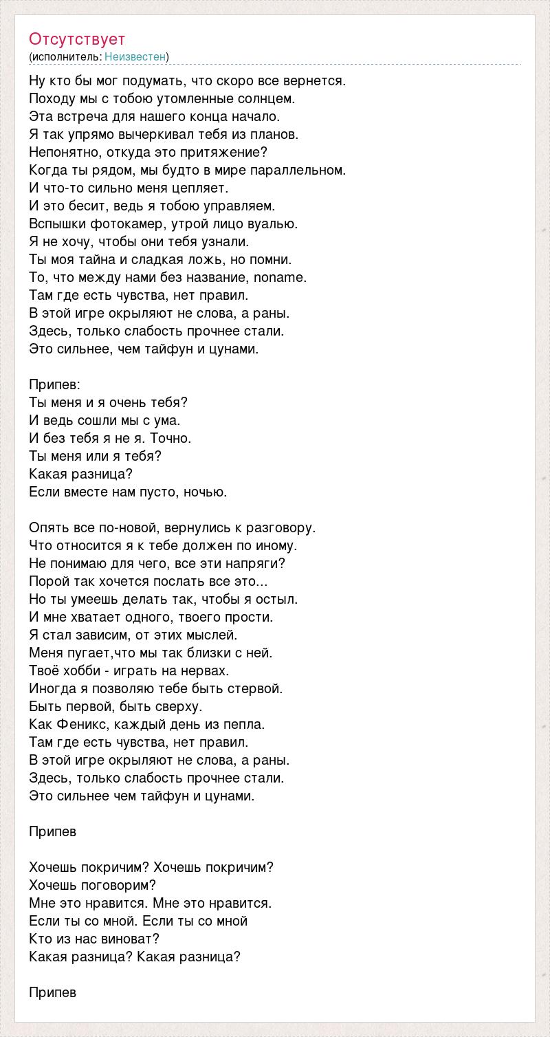 Ну кто бы мог подумать, что скоро все вернется. Походу мы с тобою утомленные солнцем. Эта встреча для нашего конца начало. Я так упрямо вычеркивал тебя из планов. Непонятно, откуда это притяжение? Когда ты рядом, мы будто в мире параллельном. И что-то сильно меня цепляет. И это бесит, ведь я тобою управляем. Вспышки фотокамер, утрой лицо вуалью. Я не хочу, чтобы они тебя узнали. Ты моя тайна и сладкая ложь, но помни. То, что между нами без название, noname. Там где есть чувства, нет правил. В этой игре окрыляют не слова, а раны. Здесь, только слабость прочнее стали. Это сильнее, чем тайфун и цунами. Припев: Ты меня и я очень тебя? И ведь сошли мы с ума. И без тебя я не я. Точно. Ты меня или я тебя? Какая разница? Если вместе нам пусто, ночью. Опять все по-новой, вернулись к разговору. Что относится я к тебе должен по иному. Не понимаю для чего, все эти напряги? Порой так хочется послать все это... Но ты умеешь делать так, чтобы я остыл. И мне хватает одного, твоего прости. Я стал зависим, от этих мыслей. Меня пугает,что мы так близки с ней. Твоё хобби - играть на нервах. Иногда я позволяю тебе быть стервой. Быть первой, быть сверху. Как Феникс, каждый день из пепла. Там где есть чувства, нет правил. В этой игре окрыляют не слова, а раны. Здесь, только слабость прочнее стали. Это сильнее чем тайфун и цунами. Припев Хочешь покричим? Хочешь покричим? Хочешь поговорим? Мне это нравится. Мне это нравится. Если ты со мной. Если ты со мной Кто из нас виноват? Какая разница? Какая разница? Припев