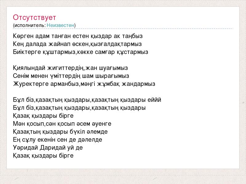 Көрген адам танған естен қыздар ак таңбыз Кең далада жайнап өскен,қызғалдақтармыз Биіктерге құштармыз,көкке самғар құстармыз Қиялындай жигиттердің,жан шуағымыз Сенім менен үміттердің шам шырағымыз Журектерге арманбыз,мәңгі жұмбақ жандармыз Бұл біз,қазақтың қыздары,қазақтың қыздары еййй Бұл біз,қазақтың қыздары,қазақтың қыздары Қазақ қыздары бірге Мән қосып,сән қосып әсем әуенге Қазақтың қыздары бүкіл әлемде Ең сұлу екенін сен де дәлелде Уәридай Даридай уй де Қазақ қыздары бірге