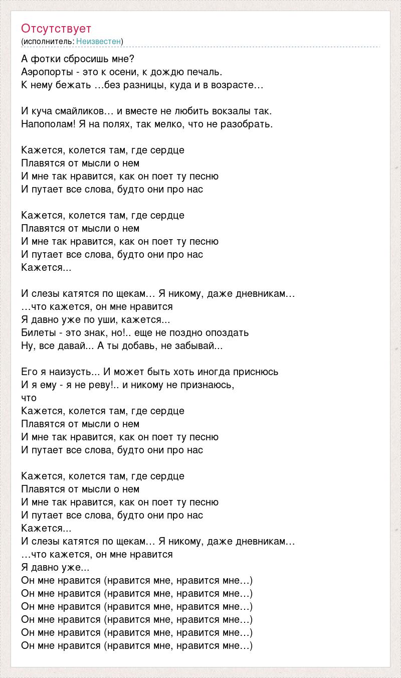 А фотки сбросишь мне? Аэропорты - это к осени, к дождю печаль. К нему бежать …без разницы, куда и в возрасте… И куча смайликов… и вместе не любить вокзалы так. Напополам! Я на полях, так мелко, что не разобрать. Кажется, колется там, где сердце Плавятся от мысли о нем И мне так нравится, как он поет ту песню И путает все слова, будто они про нас Кажется, колется там, где сердце Плавятся от мысли о нем И мне так нравится, как он поет ту песню И путает все слова, будто они про нас Кажется... И слезы катятся по щекам… Я никому, даже дневникам… …что кажется, он мне нравится Я давно уже по уши, кажется... Билеты - это знак, но!.. еще не поздно опоздать Ну, все давай... А ты добавь, не забывай... Его я наизусть... И может быть хоть иногда приснюсь И я ему - я не реву!.. и никому не признаюсь, что Кажется, колется там, где сердце Плавятся от мысли о нем И мне так нравится, как он поет ту песню И путает все слова, будто они про нас Кажется, колется там, где сердце Плавятся от мысли о нем И мне так нравится, как он поет ту песню И путает все слова, будто они про нас Кажется... И слезы катятся по щекам… Я никому, даже дневникам… …что кажется, он мне нравится Я давно уже... Он мне нравится (нравится мне, нравится мне…) Он мне нравится (нравится мне, нравится мне…) Он мне нравится (нравится мне, нравится мне…) Он мне нравится (нравится мне, нравится мне…) Он мне нравится (нравится мне, нравится мне…) Он мне нравится (нравится мне, нравится мне…)