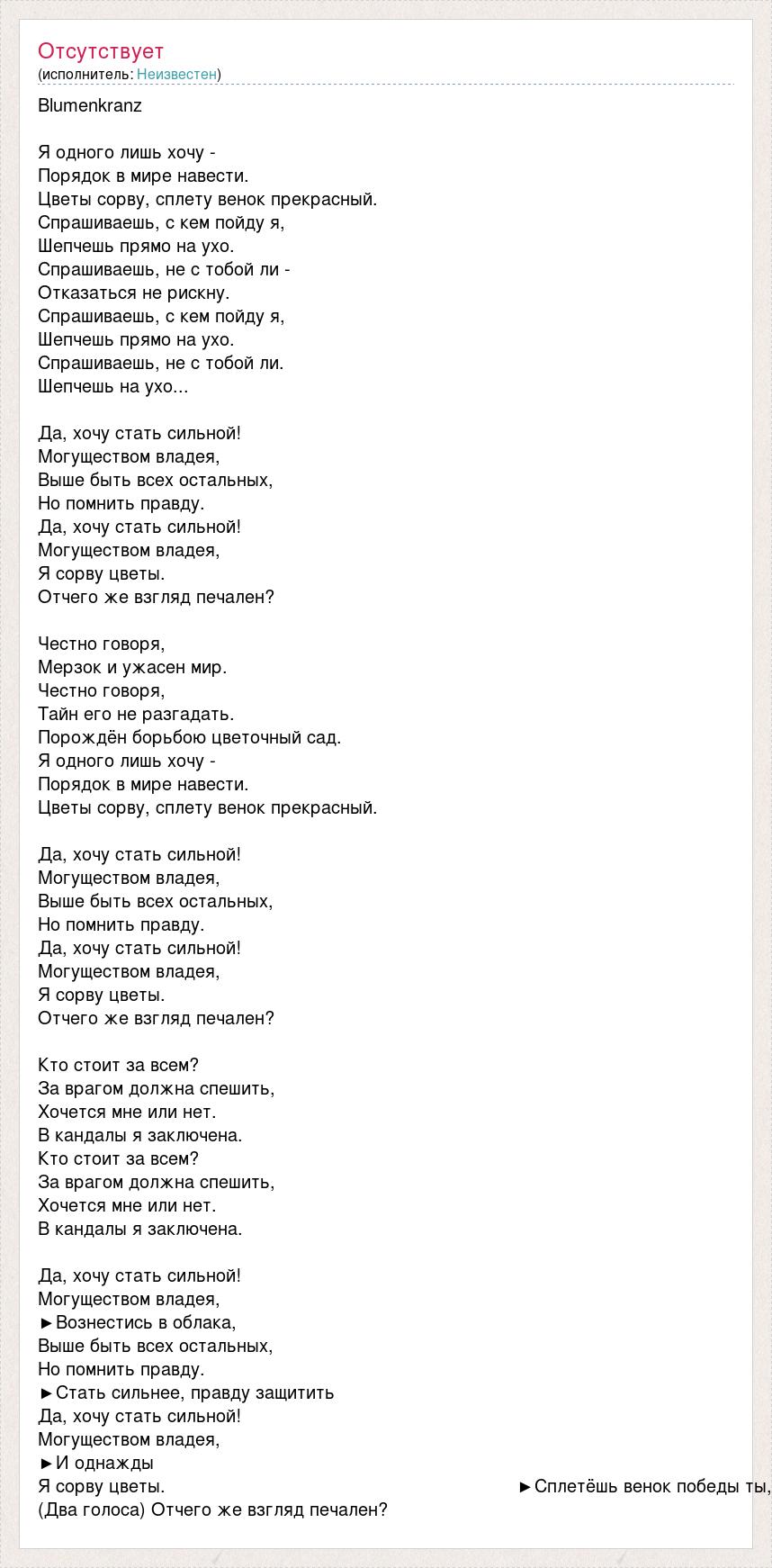 Blumenkranz Я одного лишь хочу - Порядок в мире навести. Цветы сорву, сплету венок прекрасный. Спрашиваешь, с кем пойду я, Шепчешь прямо на ухо. Спрашиваешь, не с тобой ли - Отказаться не рискну. Спрашиваешь, с кем пойду я, Шепчешь прямо на ухо. Спрашиваешь, не с тобой ли. Шепчешь на ухо... Да, хочу стать сильной! Могуществом владея, Выше быть всех остальных, Но помнить правду. Да, хочу стать сильной! Могуществом владея, Я сорву цветы. Отчего же взгляд печален? Честно говоря, Мерзок и ужасен мир. Честно говоря, Тайн его не разгадать. Порождён борьбою цветочный сад. Я одного лишь хочу - Порядок в мире навести. Цветы сорву, сплету венок прекрасный. Да, хочу стать сильной! Могуществом владея, Выше быть всех остальных, Но помнить правду. Да, хочу стать сильной! Могуществом владея, Я сорву цветы. Отчего же взгляд печален? Кто стоит за всем? За врагом должна спешить, Хочется мне или нет. В кандалы я заключена. Кто стоит за всем? За врагом должна спешить, Хочется мне или нет. В кандалы я заключена. Да, хочу стать сильной! Могуществом владея, ►Вознестись в облака, Выше быть всех остальных, Но помнить правду. ►Стать сильнее, правду защитить Да, хочу стать сильной! Могуществом владея, ►И однажды Я сорву цветы. ►Сплетёшь венок победы ты, (Два голоса) Отчего же взгляд печален?