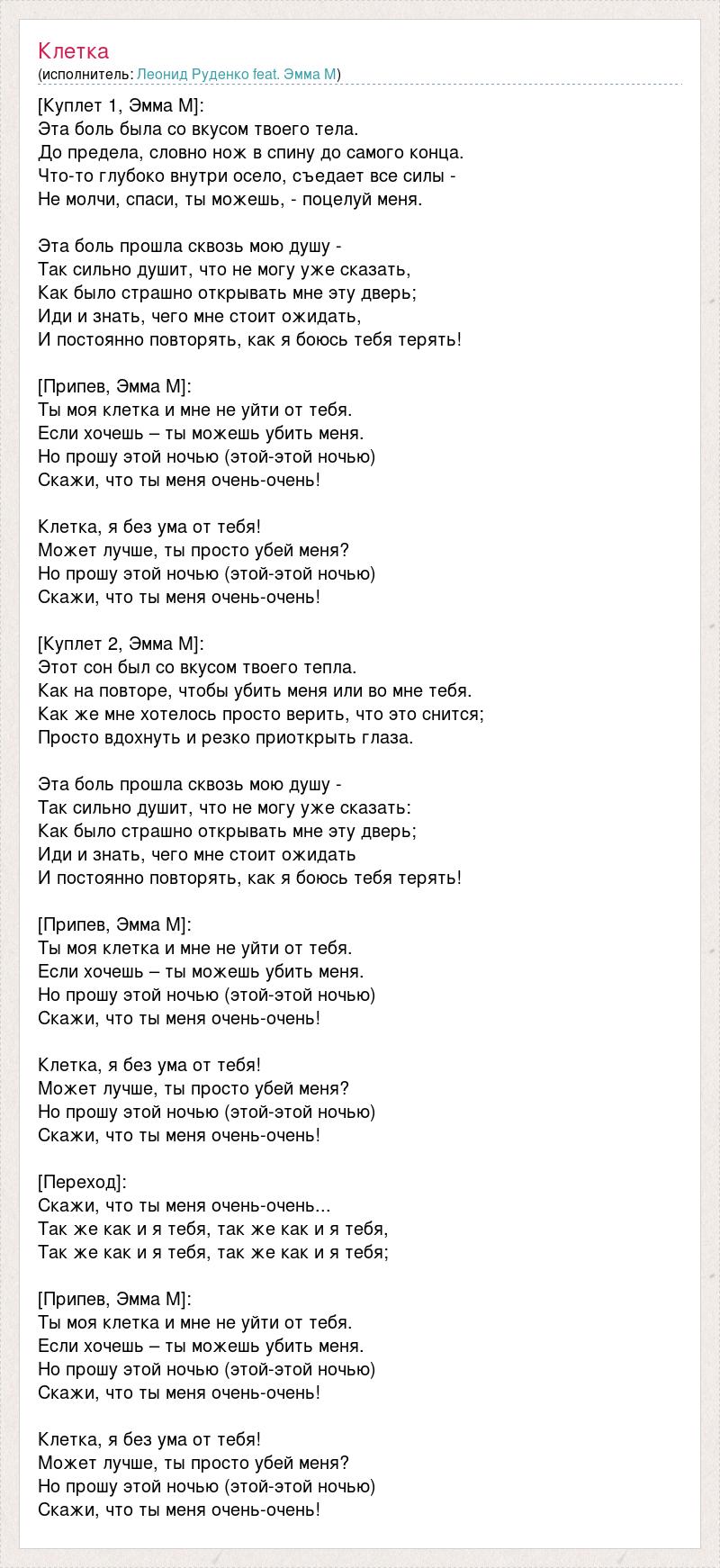 [Куплет 1, Эмма М]: Эта боль была со вкусом твоего тела. До предела, словно нож в спину до самого конца. Что-то глубоко внутри осело, съедает все силы - Не молчи, спаси, ты можешь, - поцелуй меня. Эта боль прошла сквозь мою душу - Так сильно душит, что не могу уже сказать, Как было страшно открывать мне эту дверь; Иди и знать, чего мне стоит ожидать, И постоянно повторять, как я боюсь тебя терять! [Припев, Эмма М]: Ты моя клетка и мне не уйти от тебя. Если хочешь – ты можешь убить меня. Но прошу этой ночью (этой-этой ночью) Скажи, что ты меня очень-очень! Клетка, я без ума от тебя! Может лучше, ты просто убей меня? Но прошу этой ночью (этой-этой ночью) Скажи, что ты меня очень-очень! [Куплет 2, Эмма М]: Этот сон был со вкусом твоего тепла. Как на повторе, чтобы убить меня или во мне тебя. Как же мне хотелось просто верить, что это снится; Просто вдохнуть и резко приоткрыть глаза. Эта боль прошла сквозь мою душу - Так сильно душит, что не могу уже сказать: Как было страшно открывать мне эту дверь; Иди и знать, чего мне стоит ожидать И постоянно повторять, как я боюсь тебя терять! [Припев, Эмма М]: Ты моя клетка и мне не уйти от тебя. Если хочешь – ты можешь убить меня. Но прошу этой ночью (этой-этой ночью) Скажи, что ты меня очень-очень! Клетка, я без ума от тебя! Может лучше, ты просто убей меня? Но прошу этой ночью (этой-этой ночью) Скажи, что ты меня очень-очень! [Переход]: Скажи, что ты меня очень-очень... Так же как и я тебя, так же как и я тебя, Так же как и я тебя, так же как и я тебя; [Припев, Эмма М]: Ты моя клетка и мне не уйти от тебя. Если хочешь – ты можешь убить меня. Но прошу этой ночью (этой-этой ночью) Скажи, что ты меня очень-очень! Клетка, я без ума от тебя! Может лучше, ты просто убей меня? Но прошу этой ночью (этой-этой ночью) Скажи, что ты меня очень-очень!