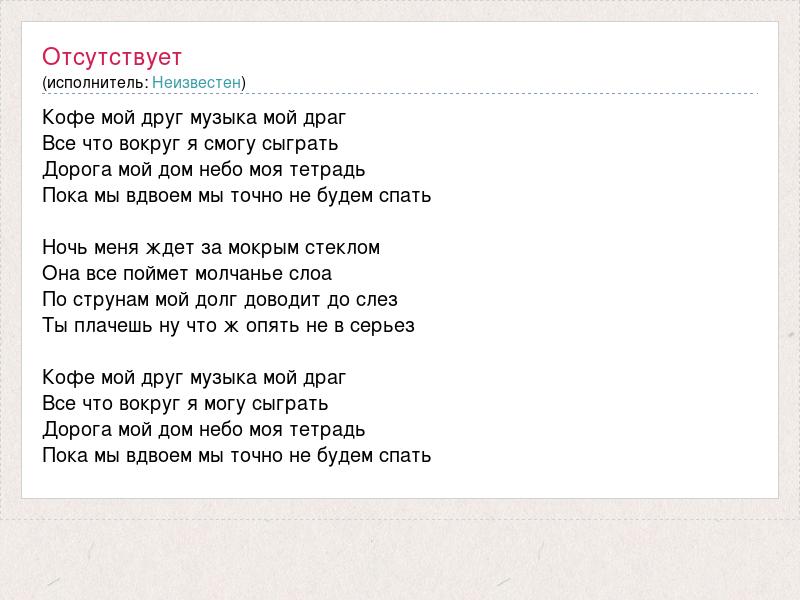 Кофе мой друг музыка мой драг Все что вокруг я смогу сыграть Дорога мой дом небо моя тетрадь Пока мы вдвоем мы точно не будем спать Ночь меня ждет за мокрым стеклом Она все поймет молчанье слоа По струнам мой долг доводит до слез Ты плачешь ну что ж опять не в серьез Кофе мой друг музыка мой драг Все что вокруг я могу сыграть Дорога мой дом небо моя тетрадь Пока мы вдвоем мы точно не будем спать