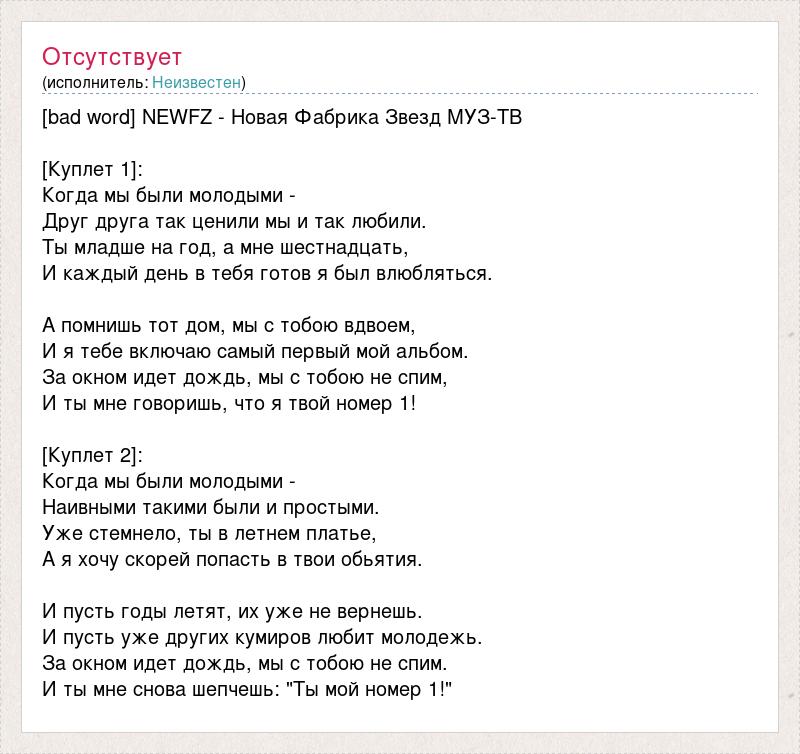 [bad word] NEWFZ - Новая Фабрика Звезд МУЗ-ТВ [Куплет 1]: Когда мы были молодыми - Друг друга так ценили мы и так любили. Ты младше на год, а мне шестнадцать, И каждый день в тебя готов я был влюбляться. А помнишь тот дом, мы с тобою вдвоем, И я тебе включаю самый первый мой альбом. За окном идет дождь, мы с тобою не спим, И ты мне говоришь, что я твой номер 1! [Куплет 2]: Когда мы были молодыми - Наивными такими были и простыми. Уже стемнело, ты в летнем платье, А я хочу скорей попасть в твои обьятия. И пусть годы летят, их уже не вернешь. И пусть уже других кумиров любит молодежь. За окном идет дождь, мы с тобою не спим. И ты мне снова шепчешь: "Ты мой номер 1!"