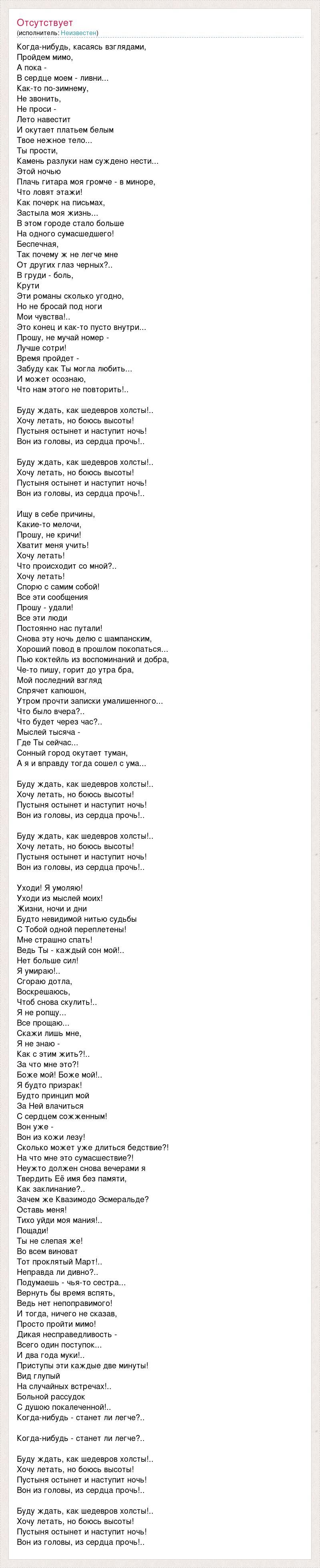 Когда-нибудь, касаясь взглядами, Пройдем мимо, А пока - В сердце моем - ливни... Как-то по-зимнему, Не звонить, Не проси - Лето навестит И окутает платьем белым Твое нежное тело... Ты прости, Камень разлуки нам суждено нести... Этой ночью Плачь гитара моя громче - в миноре, Что ловят этажи! Как почерк на письмах, Застыла моя жизнь... В этом городе стало больше На одного сумасшедшего! Беспечная, Так почему ж не легче мне От других глаз черных?.. В груди - боль, Крути Эти романы сколько угодно, Но не бросай под ноги Мои чувства!.. Это конец и как-то пусто внутри... Прошу, не мучай номер - Лучше сотри! Время пройдет - Забуду как Ты могла любить... И может осознаю, Что нам этого не повторить!.. Буду ждать, как шедевров холсты!.. Хочу летать, но боюсь высоты! Пустыня остынет и наступит ночь! Вон из головы, из сердца прочь!.. Буду ждать, как шедевров холсты!.. Хочу летать, но боюсь высоты! Пустыня остынет и наступит ночь! Вон из головы, из сердца прочь!.. Ищу в себе причины, Какие-то мелочи, Прошу, не кричи! Хватит меня учить! Хочу летать! Что происходит со мной?.. Хочу летать! Спорю с самим собой! Все эти сообщения Прошу - удали! Все эти люди Постоянно нас путали! Снова эту ночь делю с шампанским, Хороший повод в прошлом покопаться... Пью коктейль из воспоминаний и добра, Че-то пишу, горит до утра бра, Мой последний взгляд Спрячет капюшон, Утром прочти записки умалишенного... Что было вчера?.. Что будет через час?.. Мыслей тысяча - Где Ты сейчас... Сонный город окутает туман, А я и вправду тогда сошел с ума... Буду ждать, как шедевров холсты!.. Хочу летать, но боюсь высоты! Пустыня остынет и наступит ночь! Вон из головы, из сердца прочь!.. Буду ждать, как шедевров холсты!.. Хочу летать, но боюсь высоты! Пустыня остынет и наступит ночь! Вон из головы, из сердца прочь!.. Уходи! Я умоляю! Уходи из мыслей моих! Жизни, ночи и дни Будто невидимой нитью судьбы С Тобой одной переплетены! Мне страшно спать! Ведь Ты - каждый сон мой!.. Нет больше сил! Я умираю!.. Сгораю дотла, Воскрешаюсь, Чтоб снова скулить!.. Я не ропщу... Все прощаю... Скажи лишь мне, Я не знаю - Как с этим жить?!.. За что мне это?! Боже мой! Боже мой!.. Я будто призрак! Будто принцип мой За Ней влачиться С сердцем сожженным! Вон уже - Вон из кожи лезу! Сколько может уже длиться бедствие?! На что мне это сумасшествие?! Неужто должен снова вечерами я Твердить Её имя без памяти, Как заклинание?.. Зачем же Квазимодо Эсмеральде? Оставь меня! Тихо уйди моя мания!.. Пощади! Ты не слепая же! Во всем виноват Тот проклятый Март!.. Неправда ли дивно?.. Подумаешь - чья-то сестра... Вернуть бы время вспять, Ведь нет непоправимого! И тогда, ничего не сказав, Просто пройти мимо! Дикая несправедливость - Всего один поступок... И два года муки!.. Приступы эти каждые две минуты! Вид глупый На случайных встречах!.. Больной рассудок С душою покалеченной!.. Когда-нибудь - станет ли легче?.. Когда-нибудь - станет ли легче?.. Буду ждать, как шедевров холсты!.. Хочу летать, но боюсь высоты! Пустыня остынет и наступит ночь! Вон из головы, из сердца прочь!.. Буду ждать, как шедевров холсты!.. Хочу летать, но боюсь высоты! Пустыня остынет и наступит ночь! Вон из головы, из сердца прочь!..