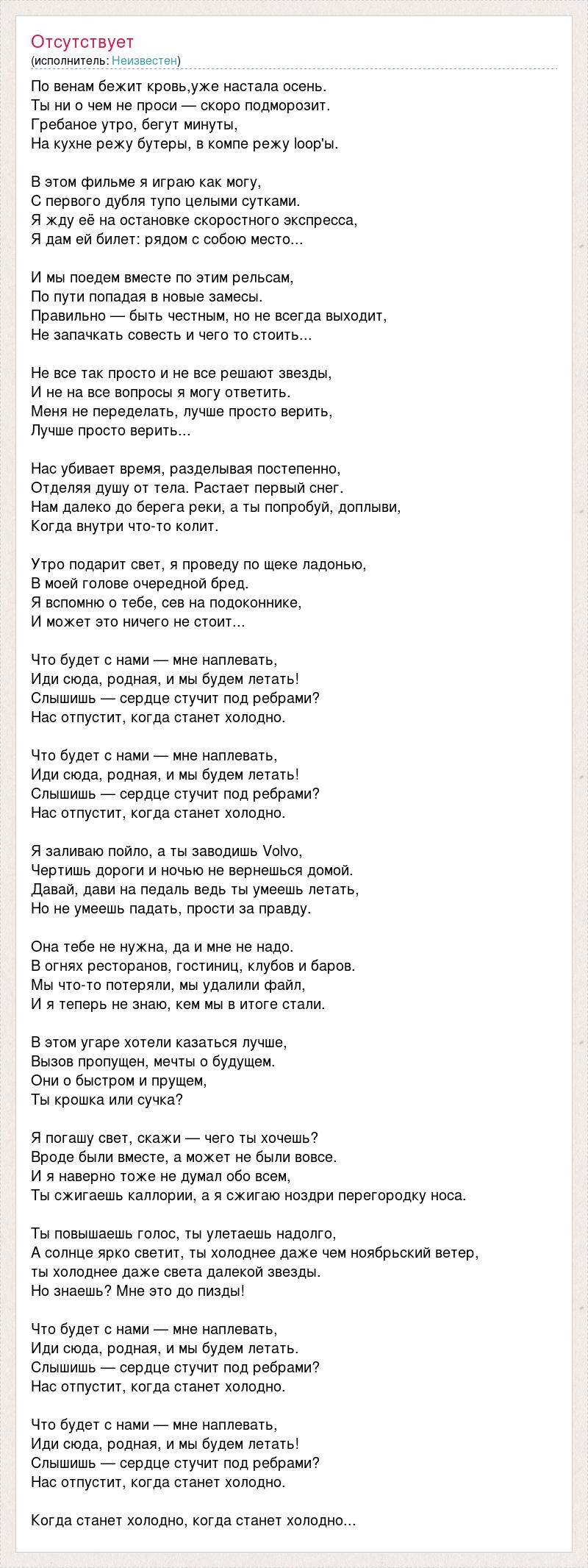 По венам бежит кровь,уже настала осень. Ты ни о чем не проси — скоро подморозит. Гребаное утро, бегут минуты, На кухне режу бутеры, в компе режу loop'ы. В этом фильме я играю как могу, С первого дубля тупо целыми сутками. Я жду её на остановке скоростного экспресса, Я дам ей билет: рядом с собою место... И мы поедем вместе по этим рельсам, По пути попадая в новые замесы. Правильно — быть честным, но не всегда выходит, Не запачкать совесть и чего то стоить... Не все так просто и не все решают звезды, И не на все вопросы я могу ответить. Меня не переделать, лучше просто верить, Лучше просто верить... Нас убивает время, разделывая постепенно, Отделяя душу от тела. Растает первый снег. Нам далеко до берега реки, а ты попробуй, доплыви, Когда внутри что-то колит. Утро подарит свет, я проведу по щеке ладонью, В моей голове очередной бред. Я вспомню о тебе, сев на подоконнике, И может это ничего не стоит... Что будет с нами — мне наплевать, Иди сюда, родная, и мы будем летать! Слышишь — сердце стучит под ребрами? Нас отпустит, когда станет холодно. Что будет с нами — мне наплевать, Иди сюда, родная, и мы будем летать! Слышишь — сердце стучит под ребрами? Нас отпустит, когда станет холодно. Я заливаю пойло, а ты заводишь Volvo, Чертишь дороги и ночью не вернешься домой. Давай, дави на педаль ведь ты умеешь летать, Но не умеешь падать, прости за правду. Она тебе не нужна, да и мне не надо. В огнях ресторанов, гостиниц, клубов и баров. Мы что-то потеряли, мы удалили файл, И я теперь не знаю, кем мы в итоге стали. В этом угаре хотели казаться лучше, Вызов пропущен, мечты о будущем. Они о быстром и прущем, Ты крошка или сучка? Я погашу свет, скажи — чего ты хочешь? Вроде были вместе, а может не были вовсе. И я наверно тоже не думал обо всем, Ты сжигаешь каллории, а я сжигаю ноздри перегородку носа. Ты повышаешь голос, ты улетаешь надолго, А солнце ярко светит, ты холоднее даже чем ноябрьский ветер, ты холоднее даже света далекой звезды. Но знаешь? Мне это до пизды! Что будет с нами — мне наплевать, Иди сюда, родная, и мы будем летать. Слышишь — сердце стучит под ребрами? Нас отпустит, когда станет холодно. Что будет с нами — мне наплевать, Иди сюда, родная, и мы будем летать! Слышишь — сердце стучит под ребрами? Нас отпустит, когда станет холодно. Когда станет холодно, когда станет холодно...