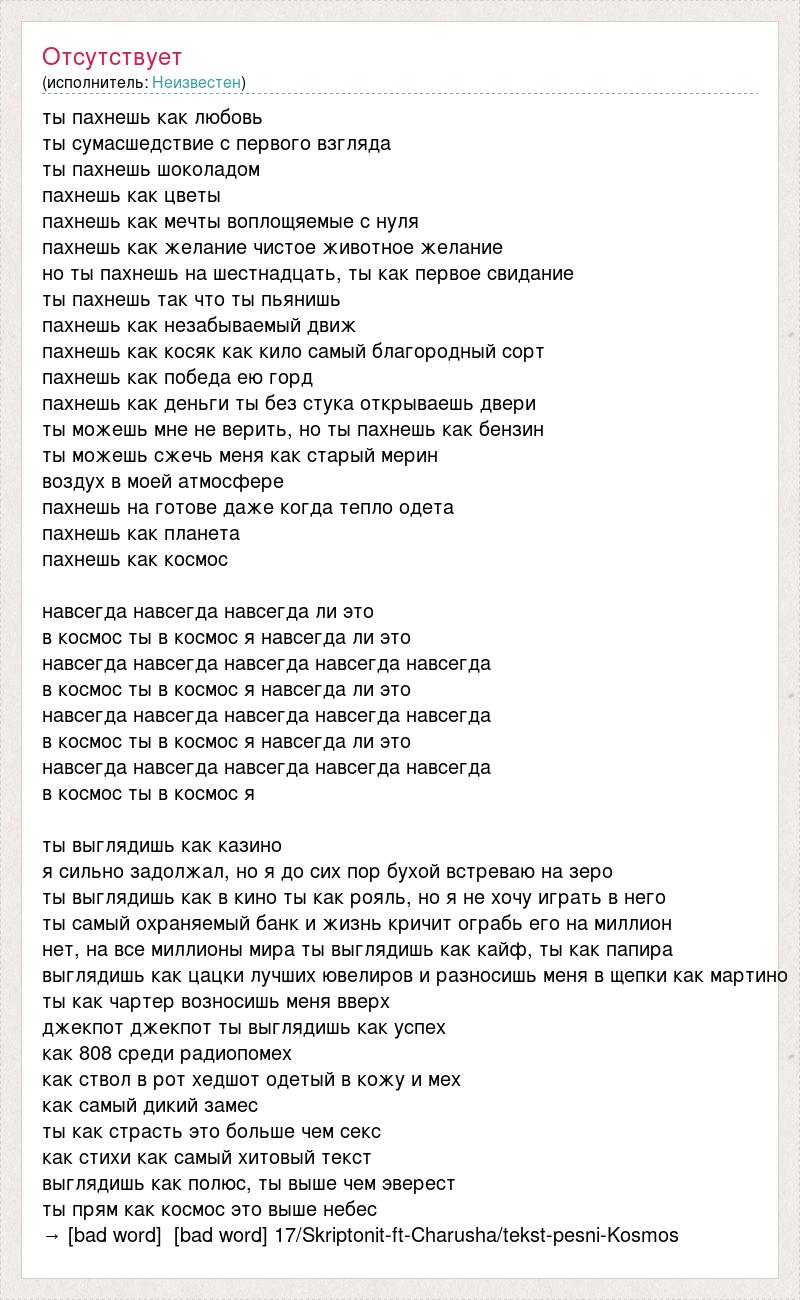 ты пахнешь как любовь ты сумасшедствие с первого взгляда ты пахнешь шоколадом пахнешь как цветы пахнешь как мечты воплощяемые с нуля пахнешь как желание чистое животное желание но ты пахнешь на шестнадцать, ты как первое свидание ты пахнешь так что ты пьянишь пахнешь как незабываемый движ пахнешь как косяк как кило самый благородный сорт пахнешь как победа ею горд пахнешь как деньги ты без стука открываешь двери ты можешь мне не верить, но ты пахнешь как бензин ты можешь сжечь меня как старый мерин воздух в моей атмосфере пахнешь на готове даже когда тепло одета пахнешь как планета пахнешь как космос навсегда навсегда навсегда ли это в космос ты в космос я навсегда ли это навсегда навсегда навсегда навсегда навсегда в космос ты в космос я навсегда ли это навсегда навсегда навсегда навсегда навсегда в космос ты в космос я навсегда ли это навсегда навсегда навсегда навсегда навсегда в космос ты в космос я ты выглядишь как казино я сильно задолжал, но я до сих пор бухой встреваю на зеро ты выглядишь как в кино ты как рояль, но я не хочу играть в него ты самый охраняемый банк и жизнь кричит ограбь его на миллион нет, на все миллионы мира ты выглядишь как кайф, ты как папира выглядишь как цацки лучших ювелиров и разносишь меня в щепки как мартино ты как чартер возносишь меня вверх джекпот джекпот ты выглядишь как успех как 808 среди радиопомех как ствол в рот хедшот одетый в кожу и мех как самый дикий замес ты как страсть это больше чем секс как стихи как самый хитовый текст выглядишь как полюс, ты выше чем эверест ты прям как космос это выше небес → [bad word] [bad word] 17/Skriptonit-ft-Charusha/tekst-pesni-Kosmos