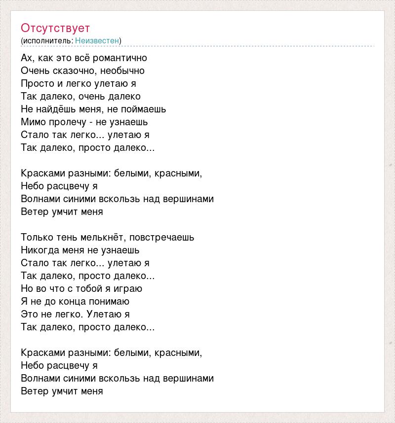 Ах, как это всё романтично Очень сказочно, необычно Просто и легко улетаю я Так далеко, очень далеко Не найдёшь меня, не поймаешь Мимо пролечу - не узнаешь Стало так легко... улетаю я Так далеко, просто далеко... Красками разными: белыми, красными, Небо расцвечу я Волнами синими вскользь над вершинами Ветер умчит меня Только тень мелькнёт, повстречаешь Никогда меня не узнаешь Стало так легко... улетаю я Так далеко, просто далеко... Но во что с тобой я играю Я не до конца понимаю Это не легко. Улетаю я Так далеко, просто далеко... Красками разными: белыми, красными, Небо расцвечу я Волнами синими вскользь над вершинами Ветер умчит меня