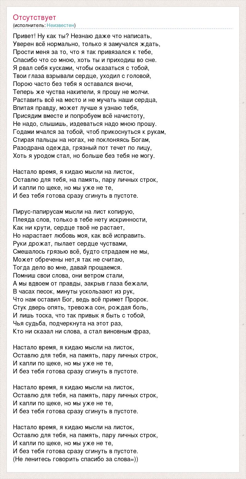 Привет! Ну как ты? Незнаю даже что написать, Уверен всё нормально, только я замучался ждать, Прости меня за то, что я так привязался к тебе, Спасибо что со мною, хоть ты и приходиш во сне. Я рвал себя кусками, чтобы оказаться с тобой, Твои глаза взрывали сердце, уходил с головой, Порою часто без тебя я оставался вночи, Теперь же чуства накипели, я прошу не молчи. Раставить всё на место и не мучать наши сердца, Впитая правду, может лучше я узнаю тебя, Присядим вместе и попробуем всё начистоту, Не надо, слышишь, издеваться надо мною прошу. Годами мчался за тобой, чтоб прикоснуться к рукам, Стирая пальцы на ногах, не поклоняясь Богам, Разодрана одежда, грязный пот течет по лицу, Хоть я уродом стал, но больше без тебя не могу. Настало время, я кидаю мысли на листок, Оставлю для тебя, на память, пару личных строк, И капли по щеке, но мы уже не те, И без тебя готова сразу сгинуть в пустоте. Пирус-папирусам мысли на лист копирую, Плеяда слов, только в тебе нету искринности, Как ни крути, сердце твоё не растает, Но нарастает любовь моя, как всё исправить. Руки дрожат, пылает сердце чуствами, Смешалось грязью всё, будто страдаем не мы, Может обречены нет,я так не считаю, Тогда дело во мне, давай прощаемся. Помниш свои слова, они ветром стали, А мы вдвоем от правды, закрыв глаза бежали, В часах песок, минуты ускользают из рук, Что нам оставил Бог, ведь всё примет Пророк. Стук дверь опять, тревожа сон, рождая боль, И лишь тоска, что так привык я быть с тобой, Чья судьба, подчеркнута на этот раз, Кто ни сказал ни слова, а стал виновным фраз, Настало время, я кидаю мысли на листок, Оставлю для тебя, на память, пару личных строк, И капли по щеке, но мы уже не те, И без тебя готова сразу сгинуть в пустоте. Настало время, я кидаю мысли на листок, Оставлю для тебя, на память, пару личных строк, И капли по щеке, но мы уже не те, И без тебя готова сразу сгинуть в пустоте. Настало время, я кидаю мысли на листок, Оставлю для тебя, на память, пару личных строк, И капли по щеке, но мы уже не те, И без тебя готова сразу сгинуть в пустоте. (Не ленитесь говорить спасибо за слова=))